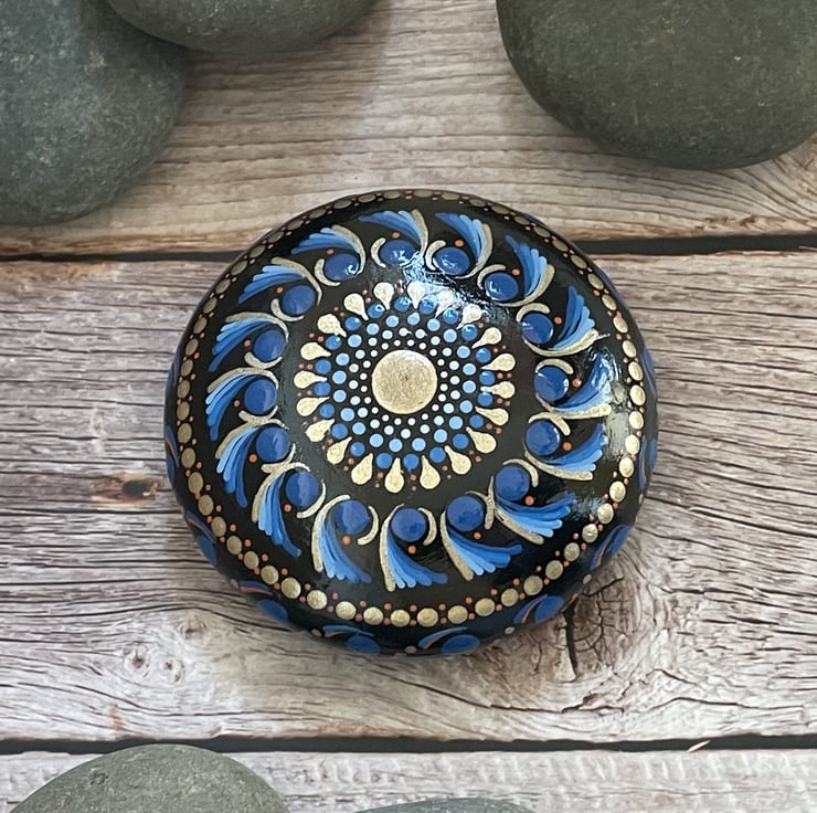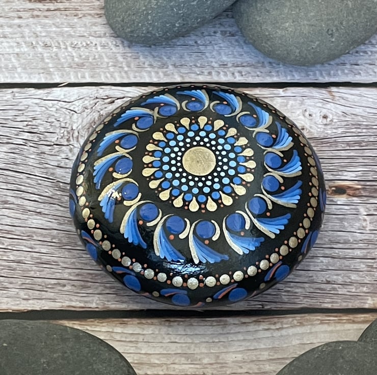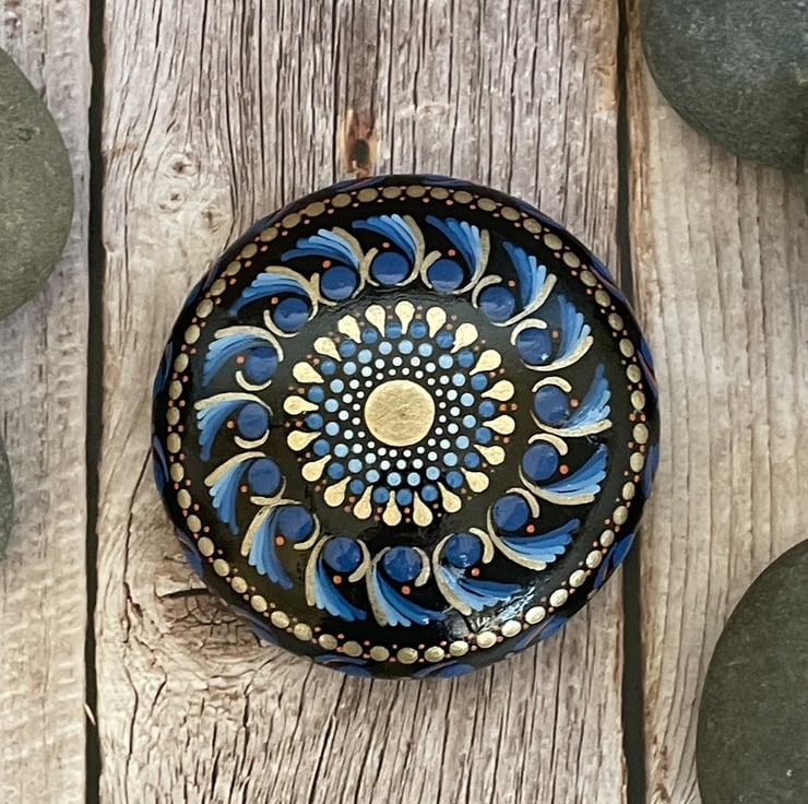 Blue Gold Mandala Painted Rock Art Stone Acrylic Painting Hand Painted Unique