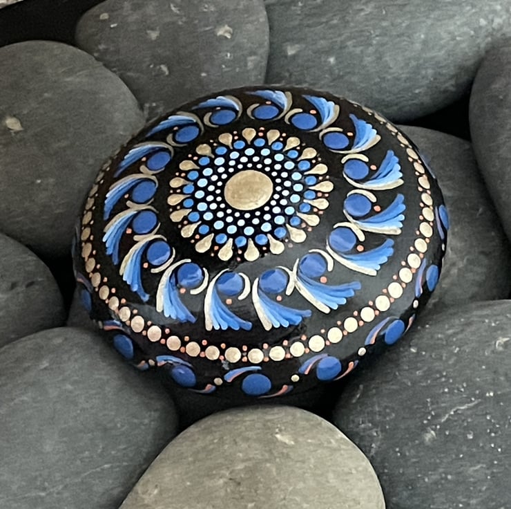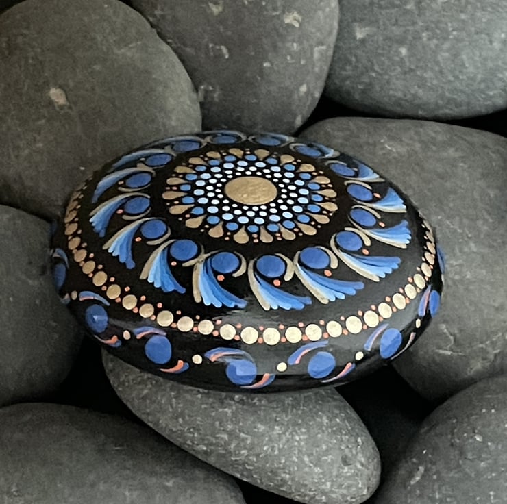 Blue and gold hand painted original and unique dot Mandala art stone - This dot Mandala art stone is a unique and beautifully crafted décor piece, hand cast in the finest quality gypsum, painted with quality artists acrylic paint and protected by a high gloss glaze for added durability. The intricate dot design on the stone creates a beautiful and eye-catching design, making it the perfect gift as a paperweight or decorative item for any indoor space. Ideal for adding a touch of charm to your home or as a thoughtful gift for someone who appreciates hand-crafted items, this one-of-a-kind piece is sure to stand out and make a statement in any room.