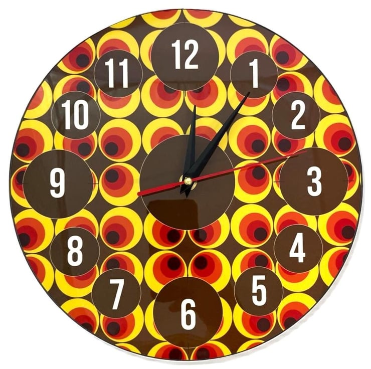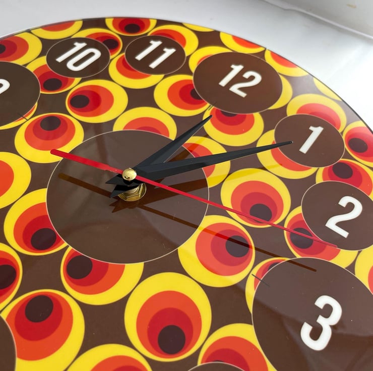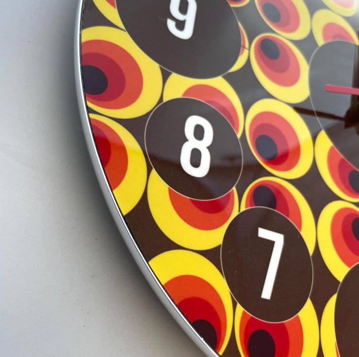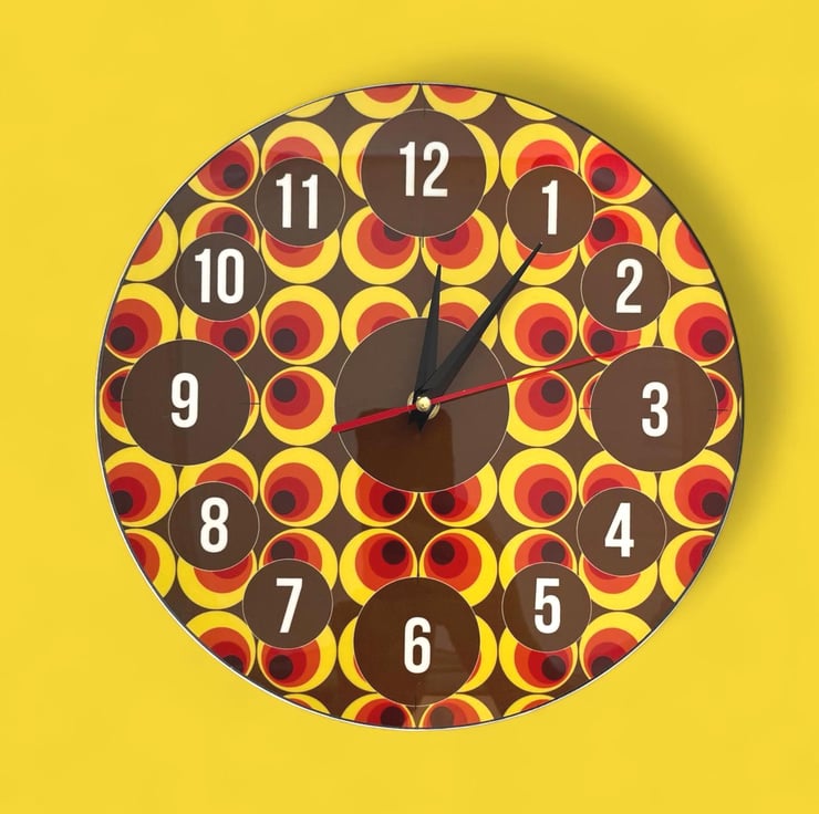 Inspired by the swinging sixties period in London's Carnaby Street area. Taking a mix of colours and design elements of the era to ctreate a vibrant clock face suitable for any retro office, living room or kitchen.