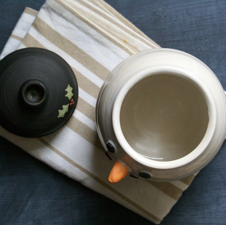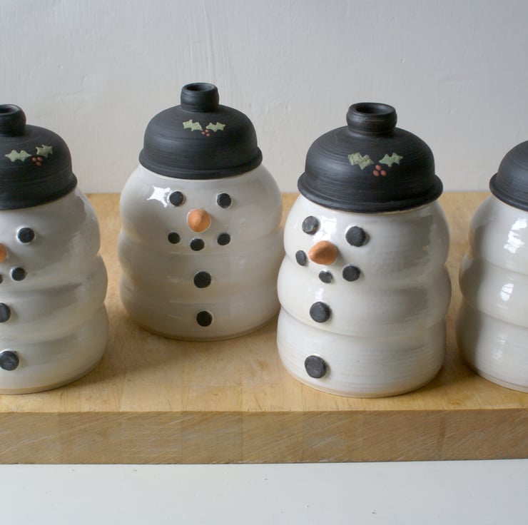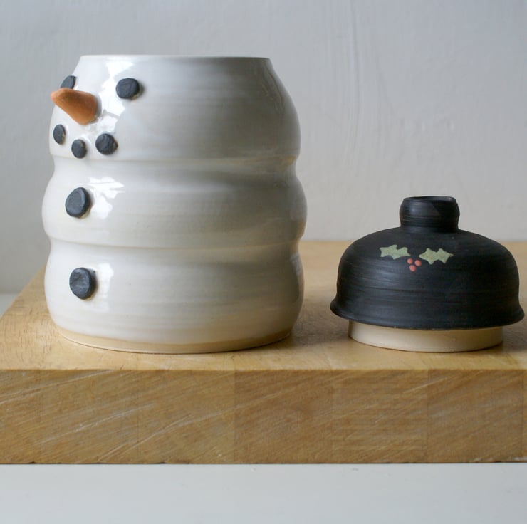 Looking for the perfect place to store your Christmas treats? Meet the snowman who won't melt! This charming hand thrown ceramic snowman jar is not only a delightful decorative piece but also a functional storage container ideal for holiday sweets and goodies. The snowman's body has a unique undulating surface to mimic the stacked snowballs of a classic snowman. Two black appliqué 'coal' buttons, smiling mouth and little eyes have been hand modelled onto the surface. A little orange carrot nose adds a pop of festive fun. The lid is shaped like a bowler hat coated in black slip and decorated with festive holly and berries. The body is glazed in a glossy white giving it a snowy touch, the bottom of the jar is stamped with the signature Little Wren Pottery logo.