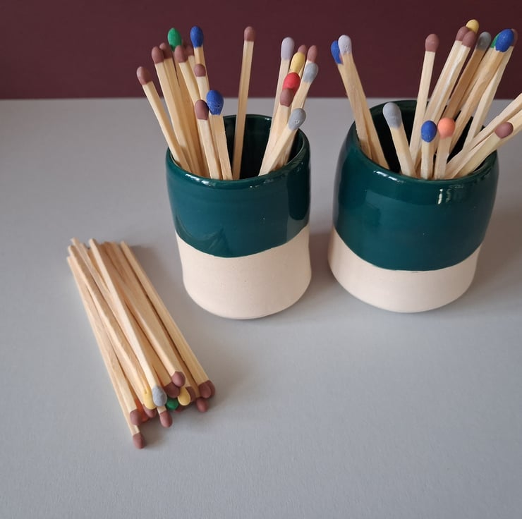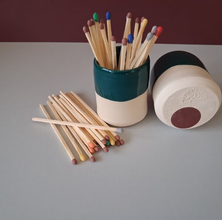 I am but a pottery baby, having only started out making different pottery items since Feb 2025. As a charity worker (day job!) and very conscious of making sure every pound counts - I wanted to make my pottery a little bit quirky - as no one pot looks the same as the other - but importantly both practical and affordable. This Match stick holder would look great in any home and used on a regular basis from lighting your fire to your candles! Great as a gift!