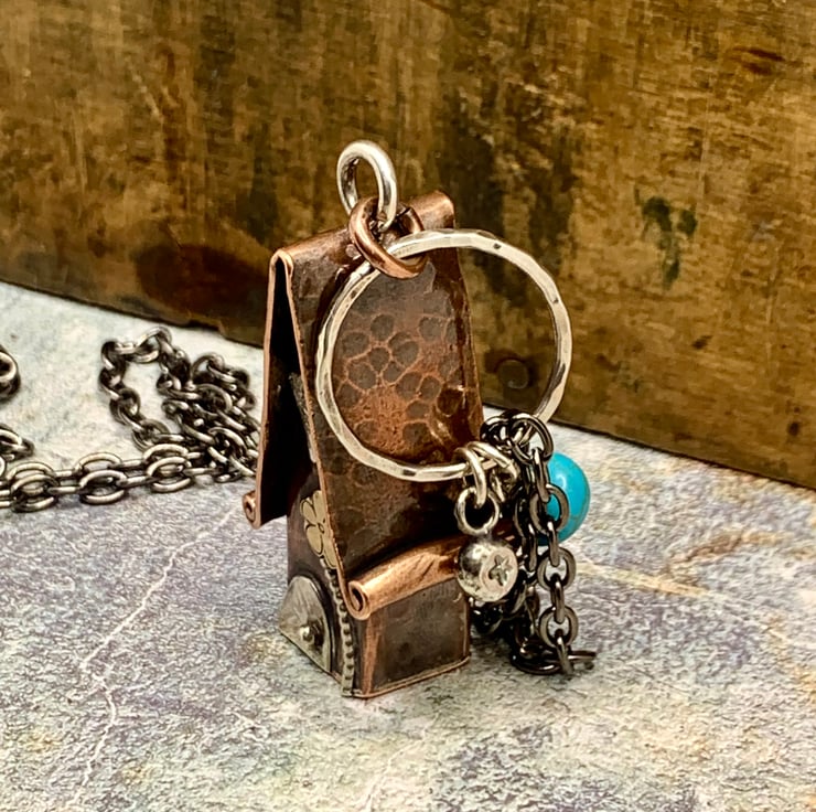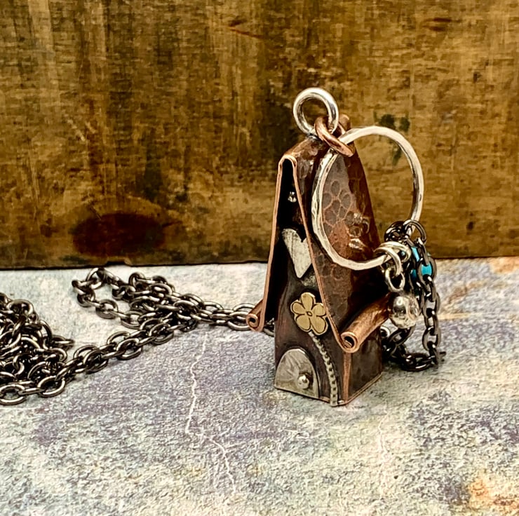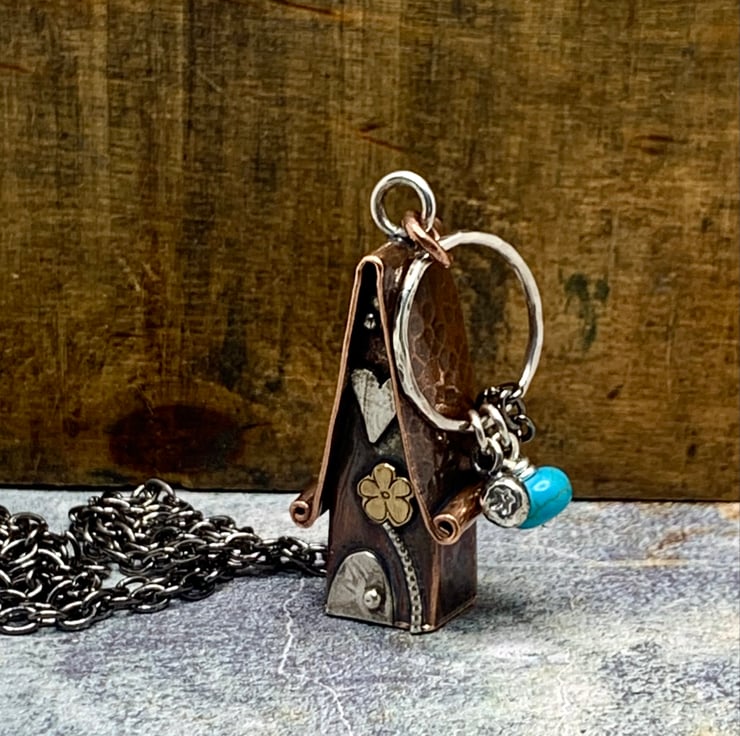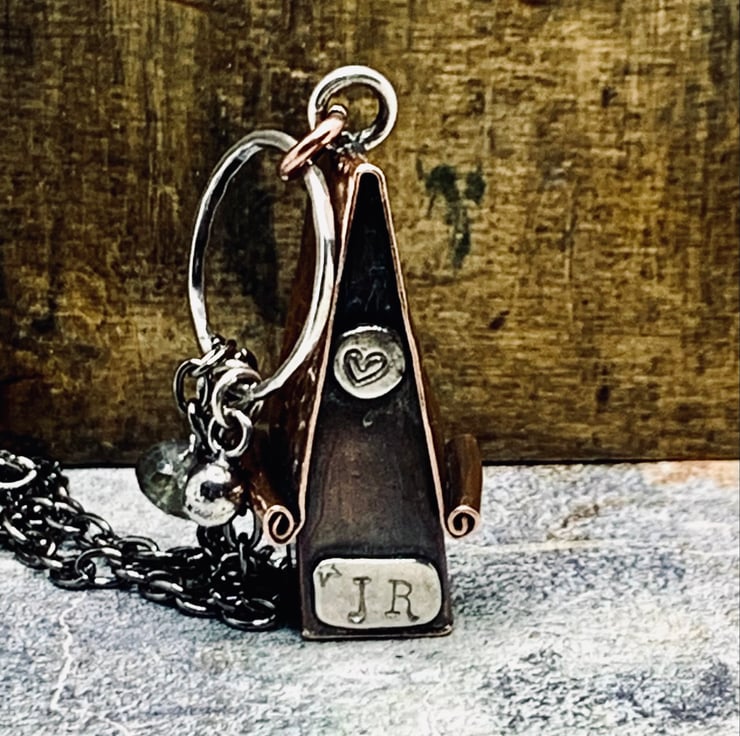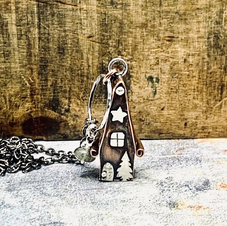 Choose from three enchanting Fairy House designs — The Flower House, The Bat House, or The Tree House — each handcrafted from copper and silver. Every house features whimsical details like a tiny door, windows, and silver accents, all topped with my signature curly roof design.