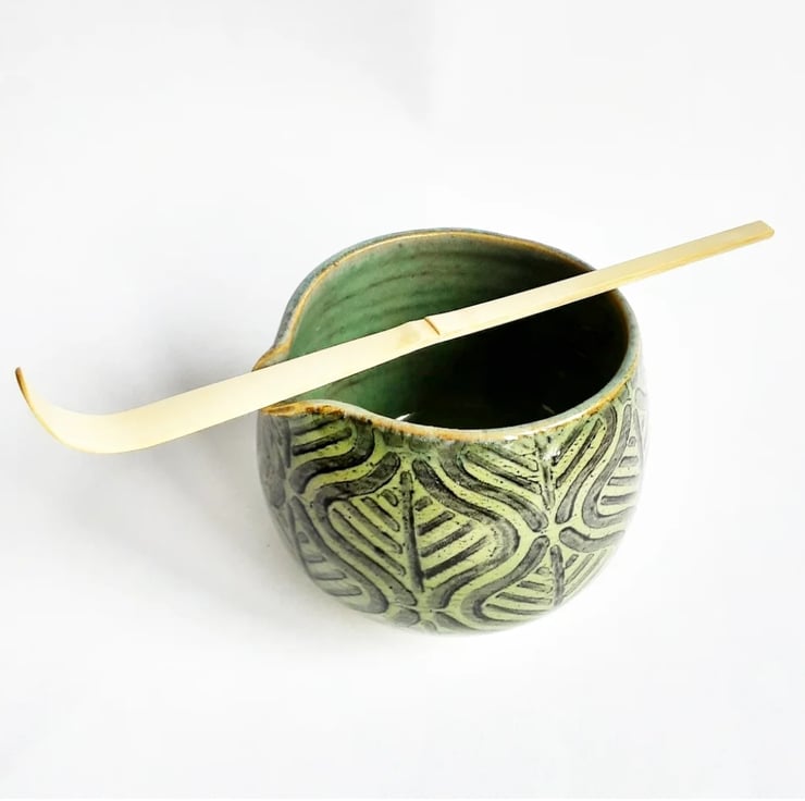 This is a handmade wheel thrown Ceramic matcha bowl with bamboo scoop