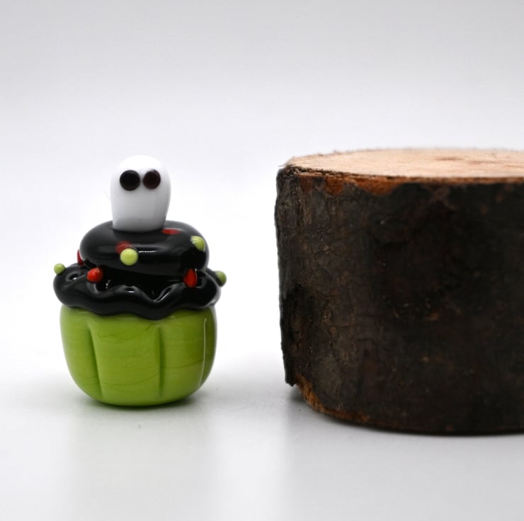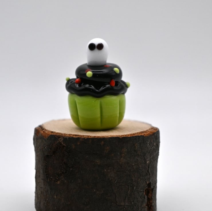 A small glass ghost cupcake made by hand using a technique called lampworking.