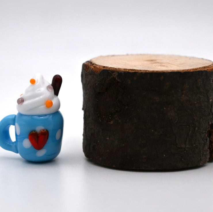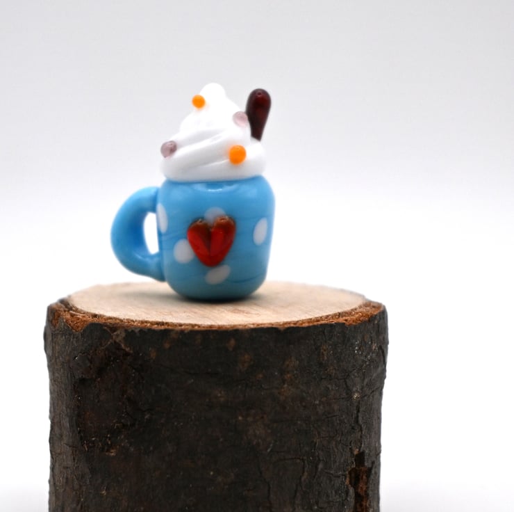 A small glass hot drink with cream and a flake made by hand using a technique called lampworking.