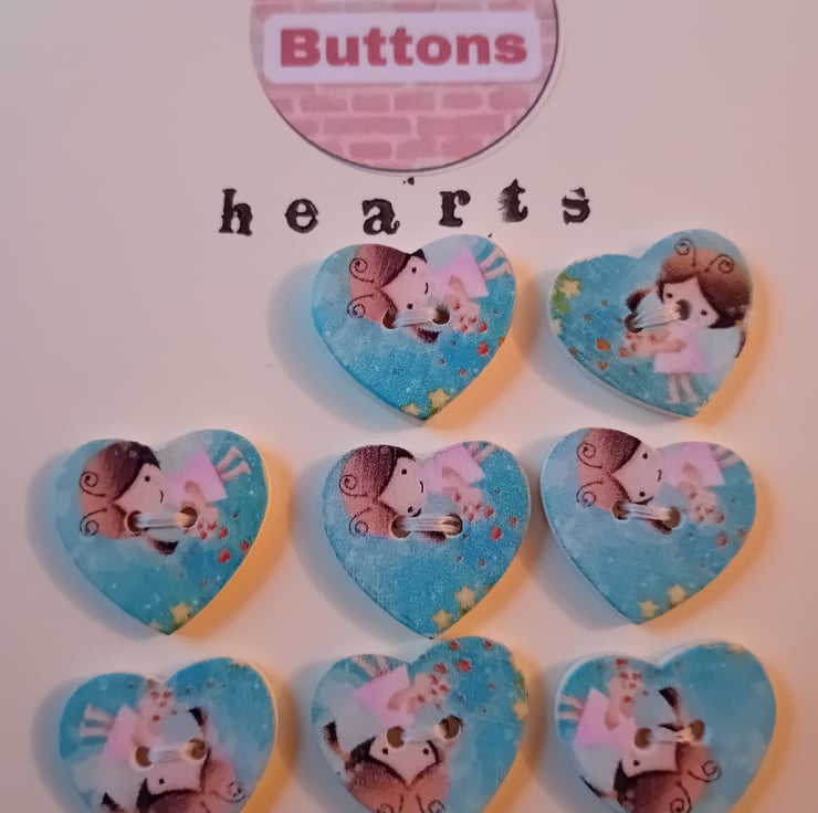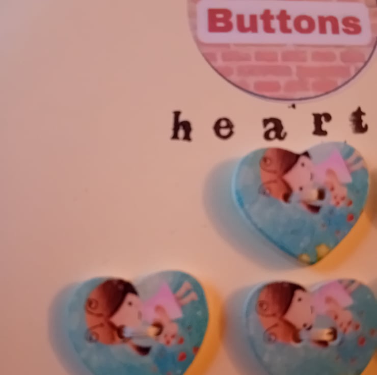 A charming little set of eight heart-shaped buttons, each featuring a whimsical illustration of a sweet character scene. With two sewing holes and a smooth plastic finish, these buttons are ready to add a touch of storybook magic to your next craft, sewing, or upcycling project.