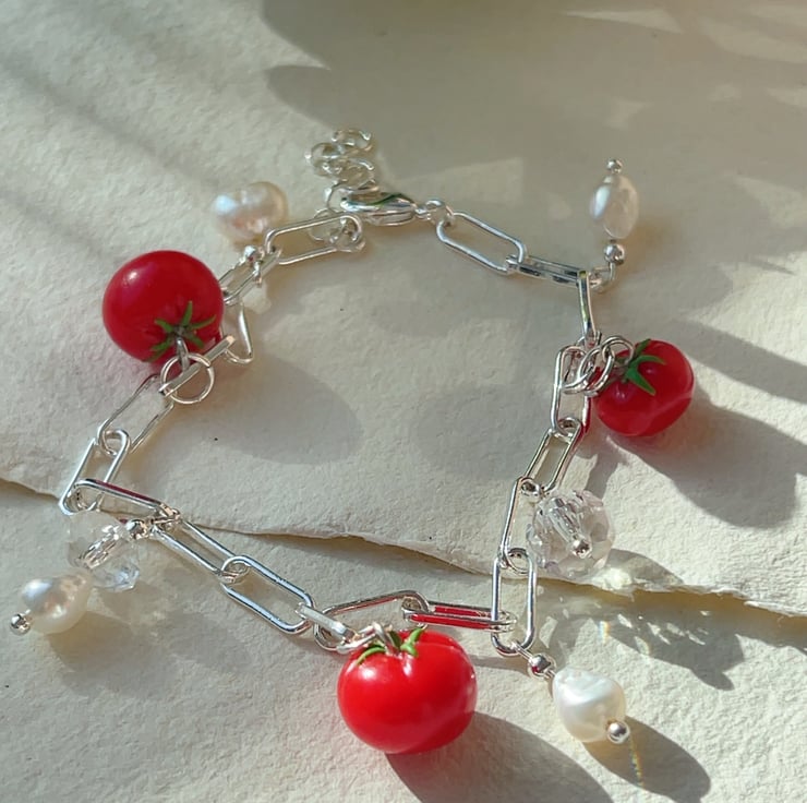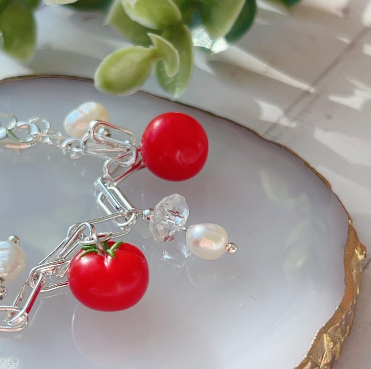 Each tomato charm is shaped by hand from polymer clay, then attached to a silver-plated chain with small imitation pearls and clear beads. It’s a mix of fun and simplicity — something bright to lift your day.