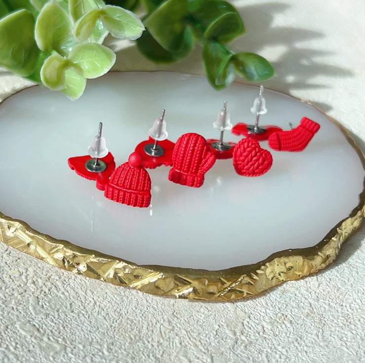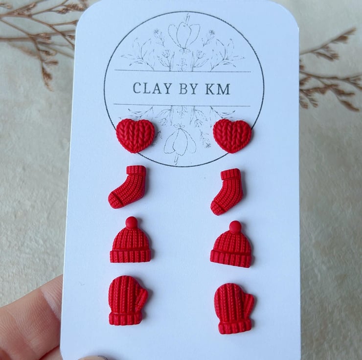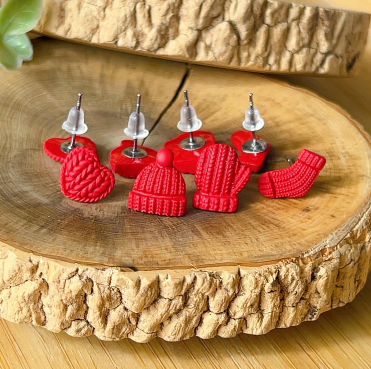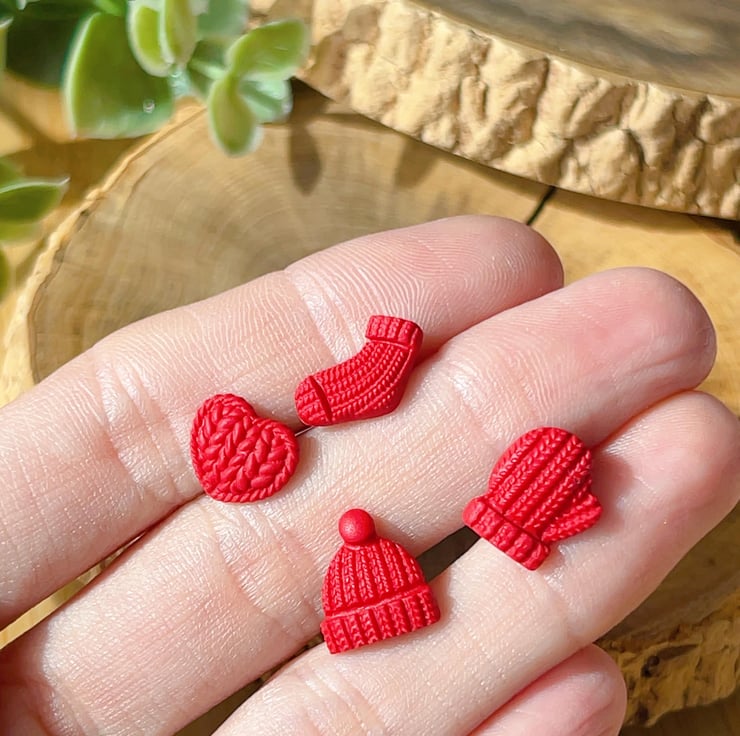 Tiny handmade earrings inspired by knitted winter textures. Each pair is from high-quality polymer clay, finished with a soft, sweater-like pattern.