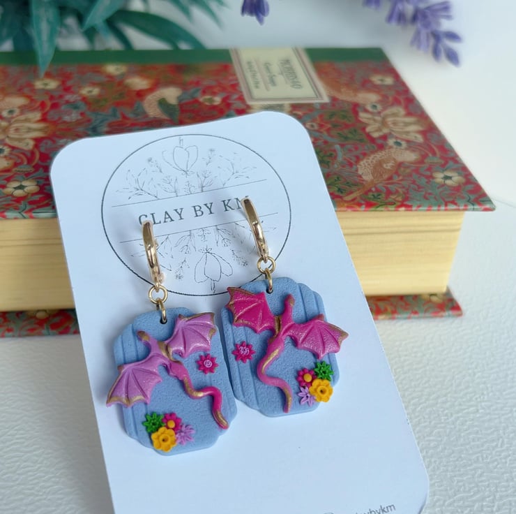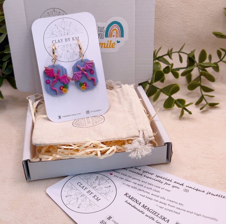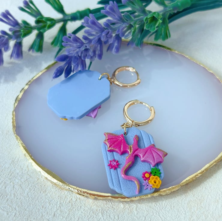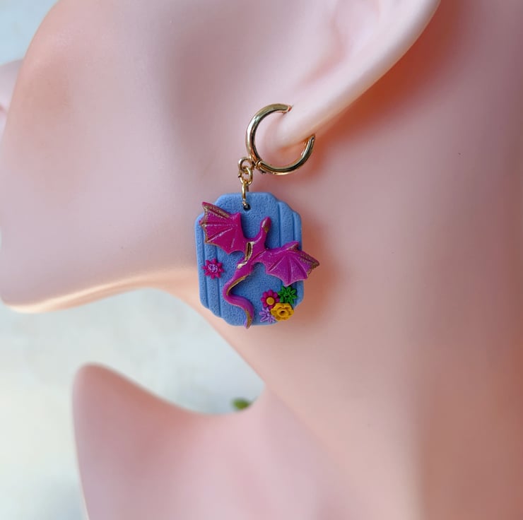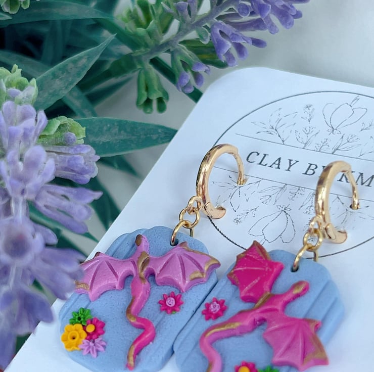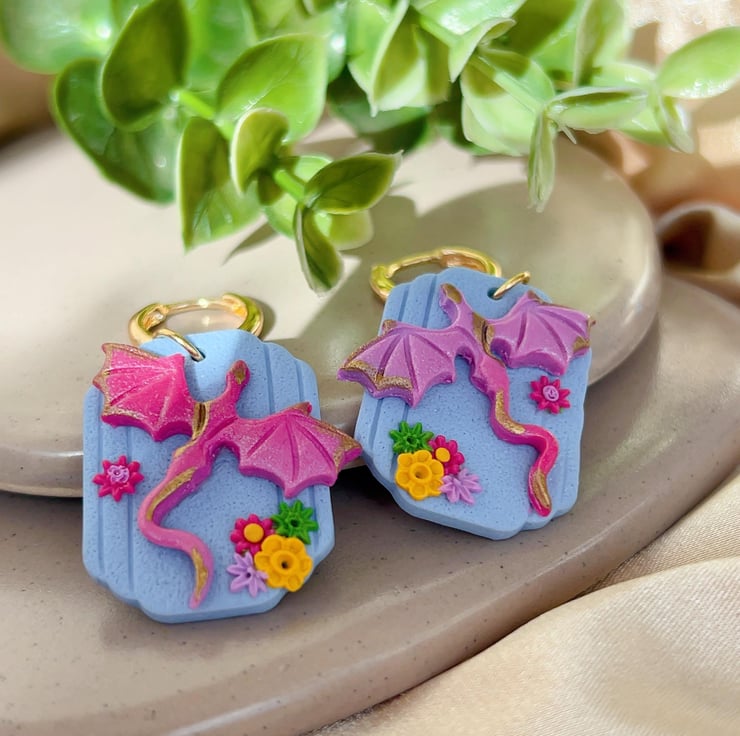 Fantasy comes alive with these dragon earrings — delicate wings, tail, and floral detail, all handmade with care. Crafted from polymer clay with gold hoops, each pair is unique.