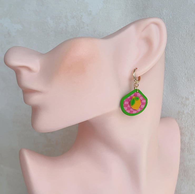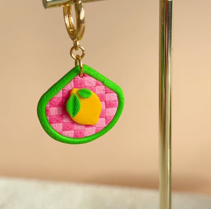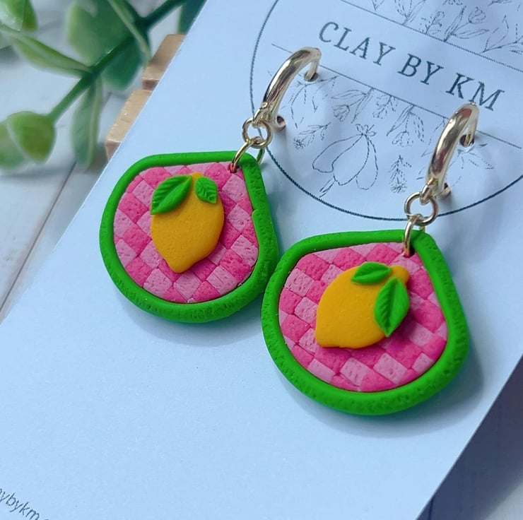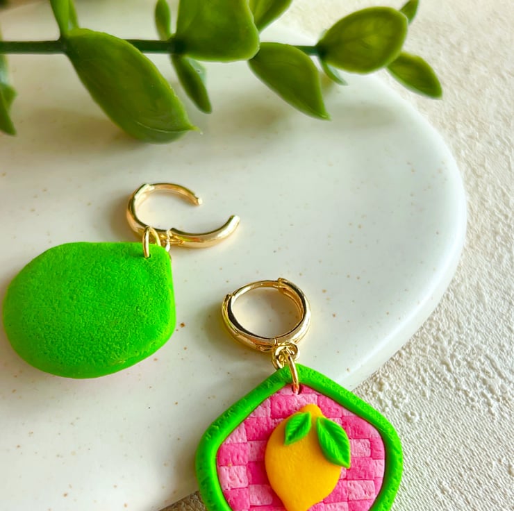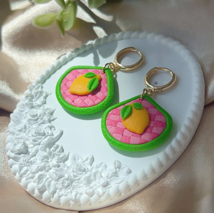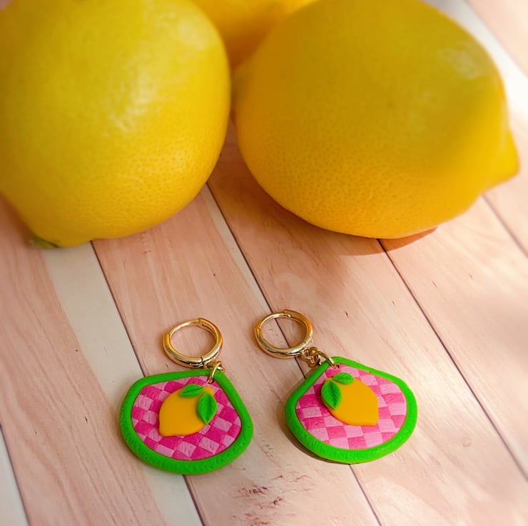 Handmade lemon earrings crafted from high-quality polymer clay and finished with hypoallergenic gold-tone hoops.