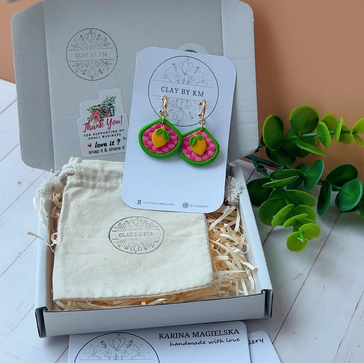 - Materials: High-quality polymer clay, hypoallergenic gold-tone hoops