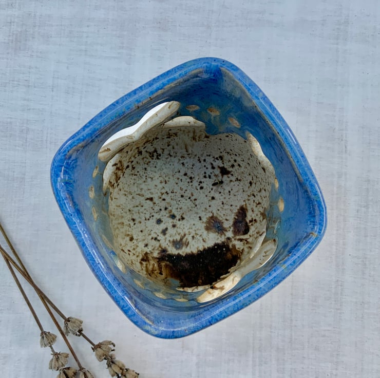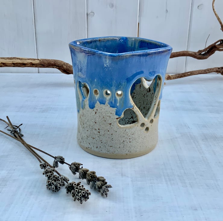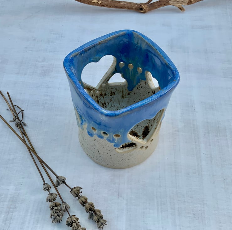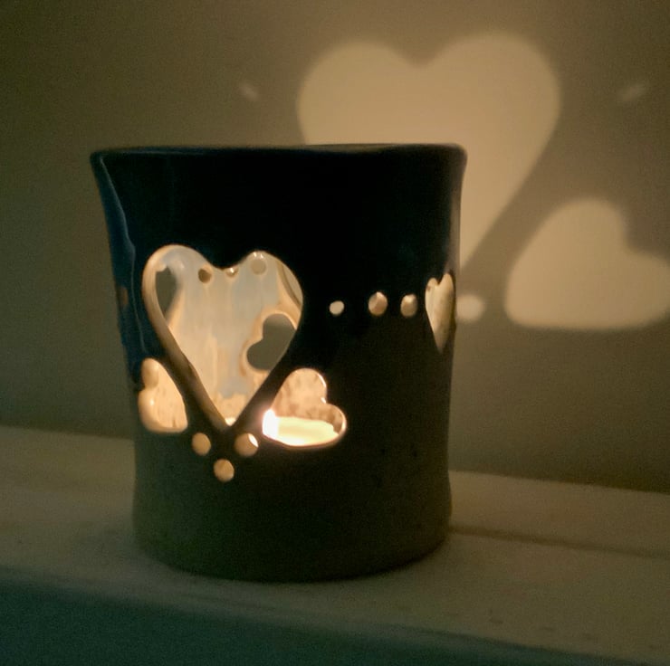 Bring a touch of charm to your home with this hand thrown candle holder. Lovingly crafted on the wheel using stoneware clay and finished in a blend of Winter Wood and Midnight Rain glazes. Hand-cut heart windows cast a gentle glow of candlelight, filling your space with warmth and calm. The piece is finished with a squared rim, adding a rustic, contemporary feel. Perfect for tealights or small candles.