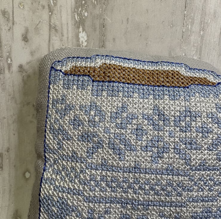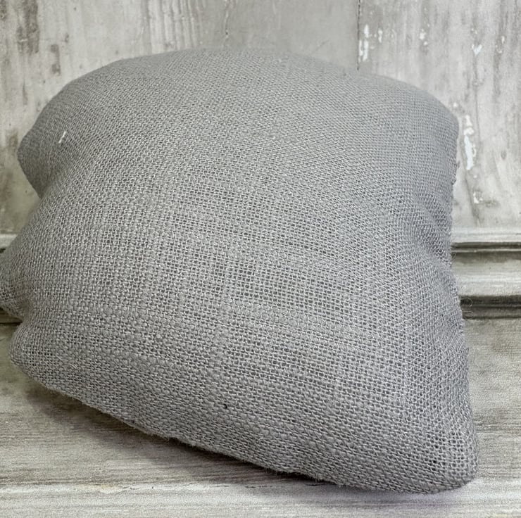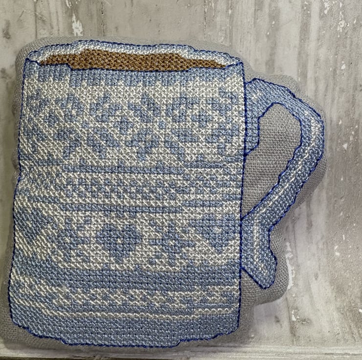 Bowl Filler machine embroidered cross stitch design. Measuring 4” x 4”. Grey pre washed linen fabric filled with polyester fibrefill. Little pillows of fun. This design represents a Mug of Coffee. Select 1 or fill a bowl full of Winter colours.
