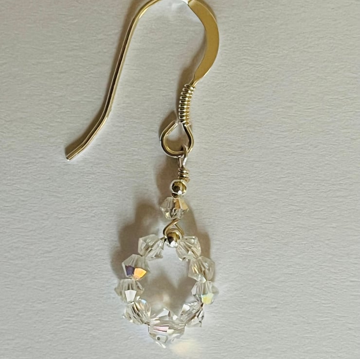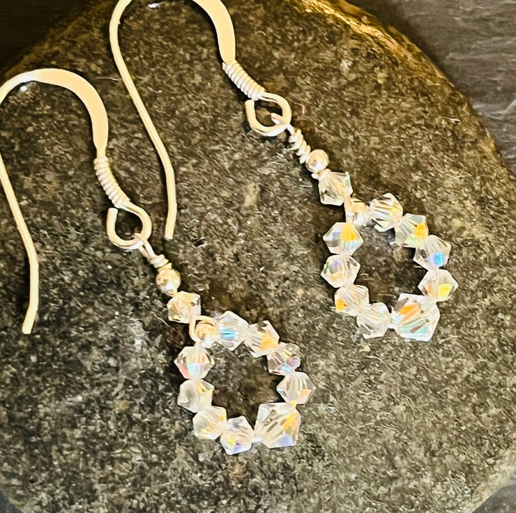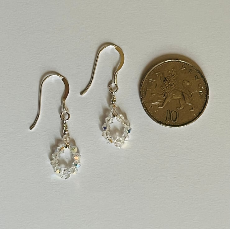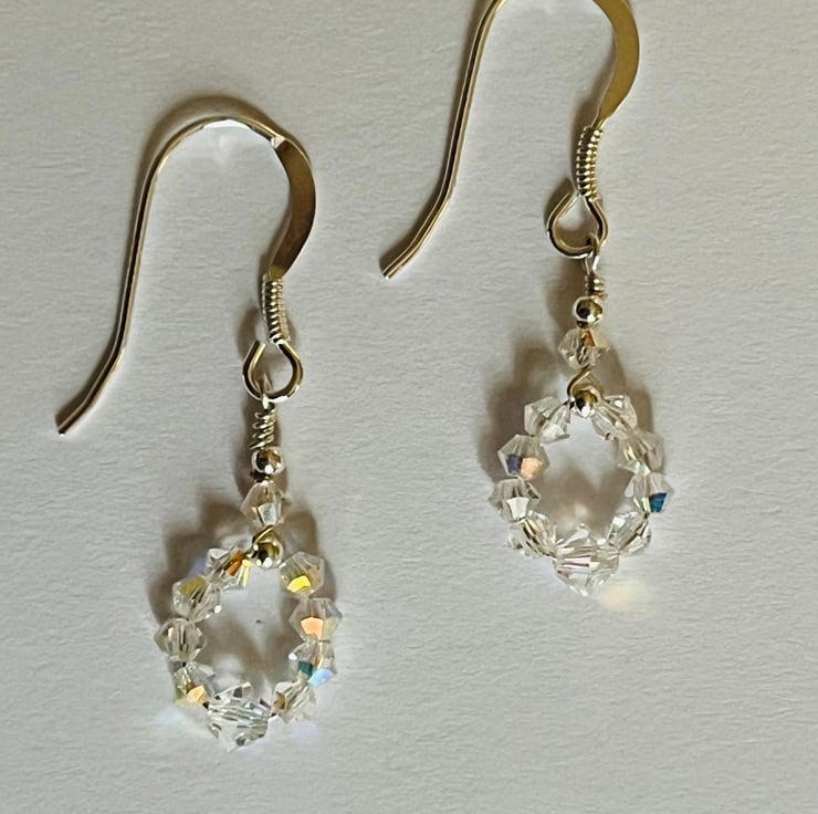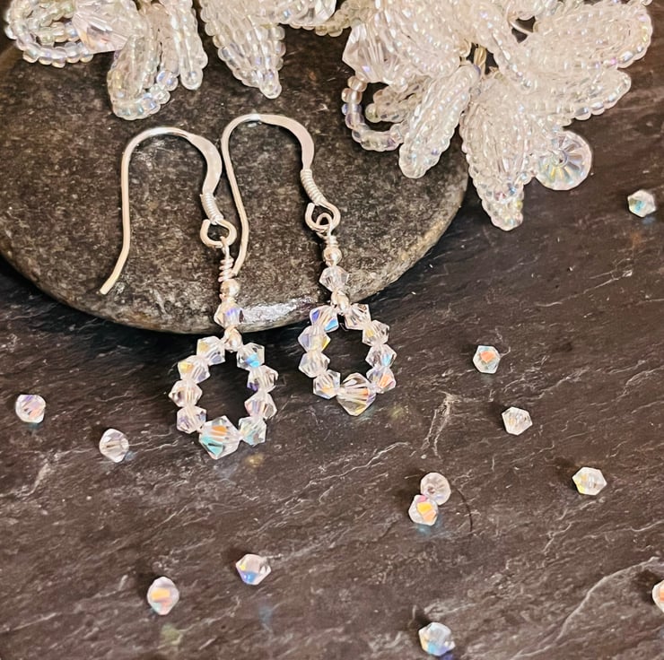 There are two sterling silver beads on the hoop and ten Preciosa crystal beads. The beads have an aurora borealis finish which, as you can see from the pictures, gives them a rainbow shimmer.