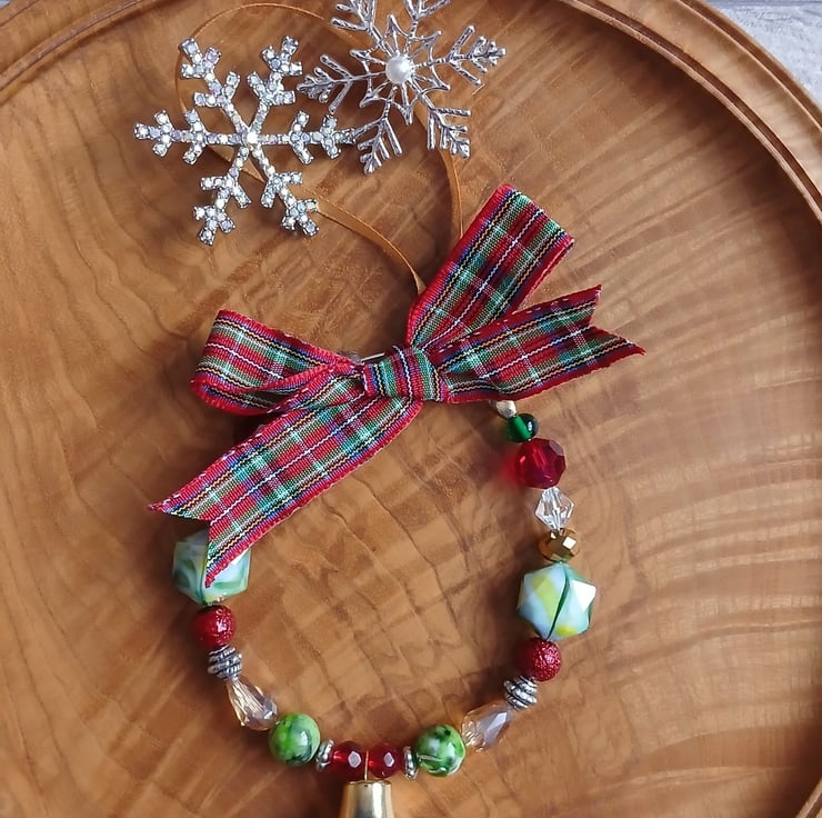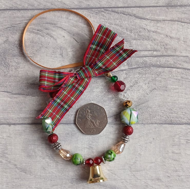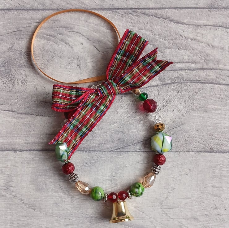 A pretty beaded ring decoration for your Christmas tree - each ring is unique and this one features in red, green, gold and silver with a little brass bell as the centre piece. The beads are strung on silver plated craft wire, and the ring is finished with a ribbon hanging loop and a coordinating tartan bow. The ring is approximately 8 cm in diameter.
