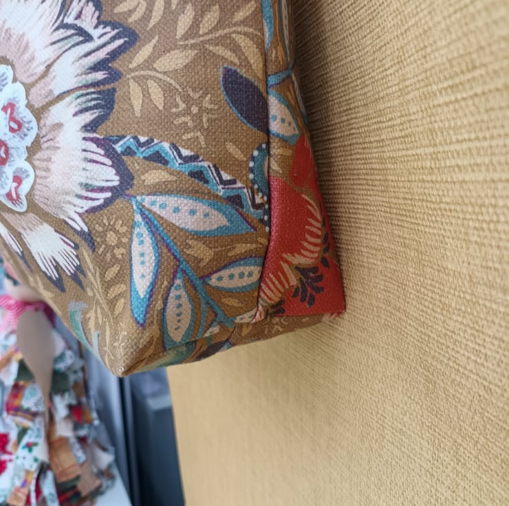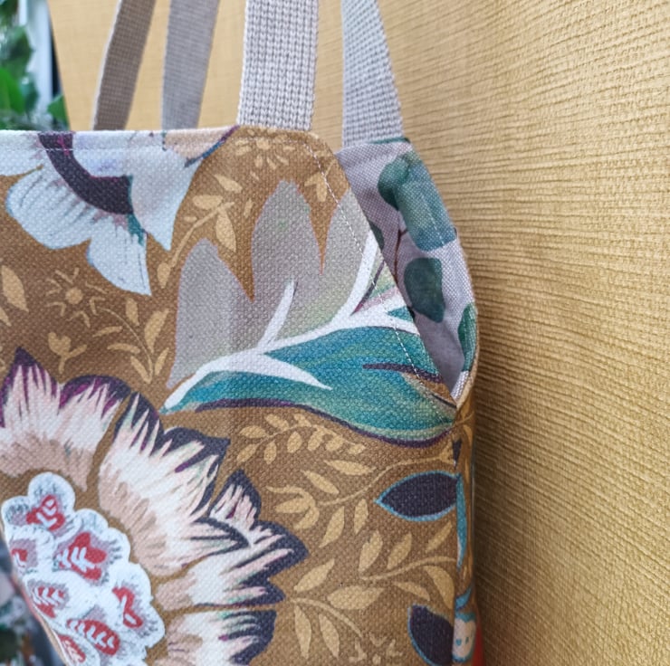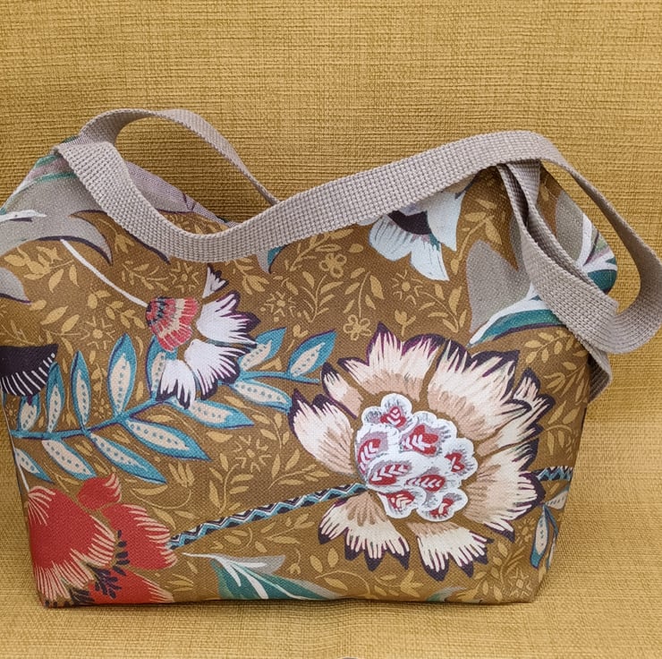 Lovely shoulder bag made with beautiful flower print upholstery fabric which gives it a durable feel. Vibrant colour. Lined with a lovely green leaf print fabric. Boxed bottom style.