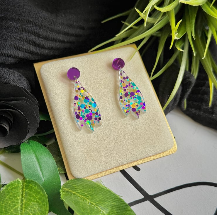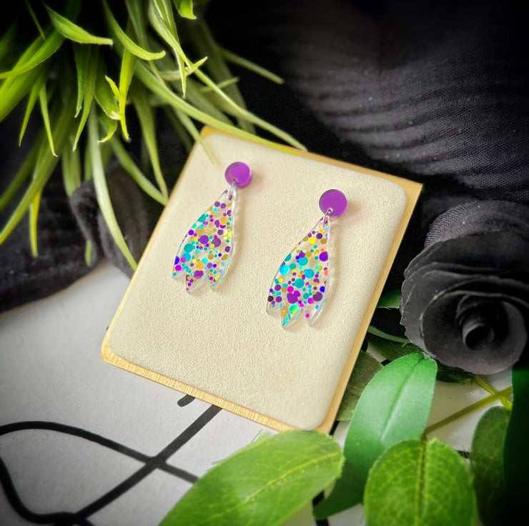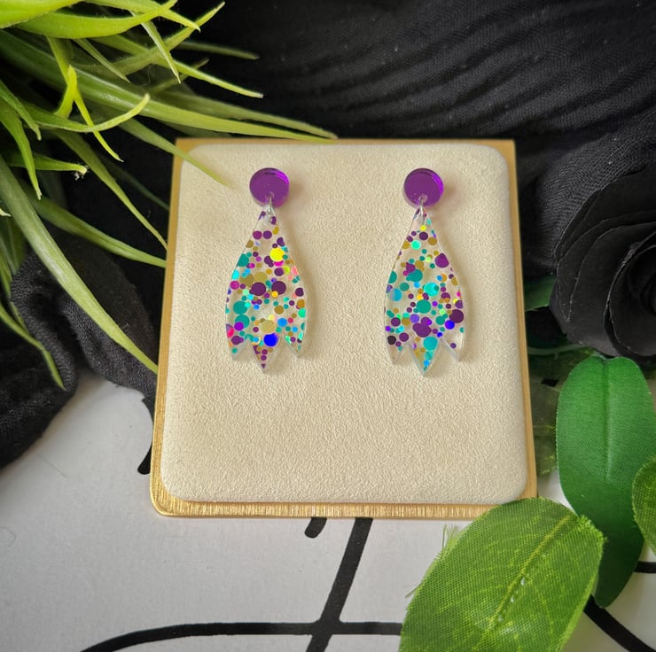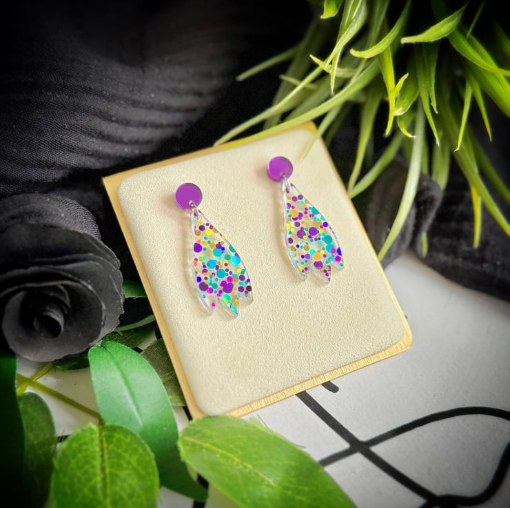 Made from lightweight, laser-cut acrylic, each pair features a playful broomstick-inspired shape filled with vibrant confetti dots with hues of purples, blues, Gold that shimmer in every light.