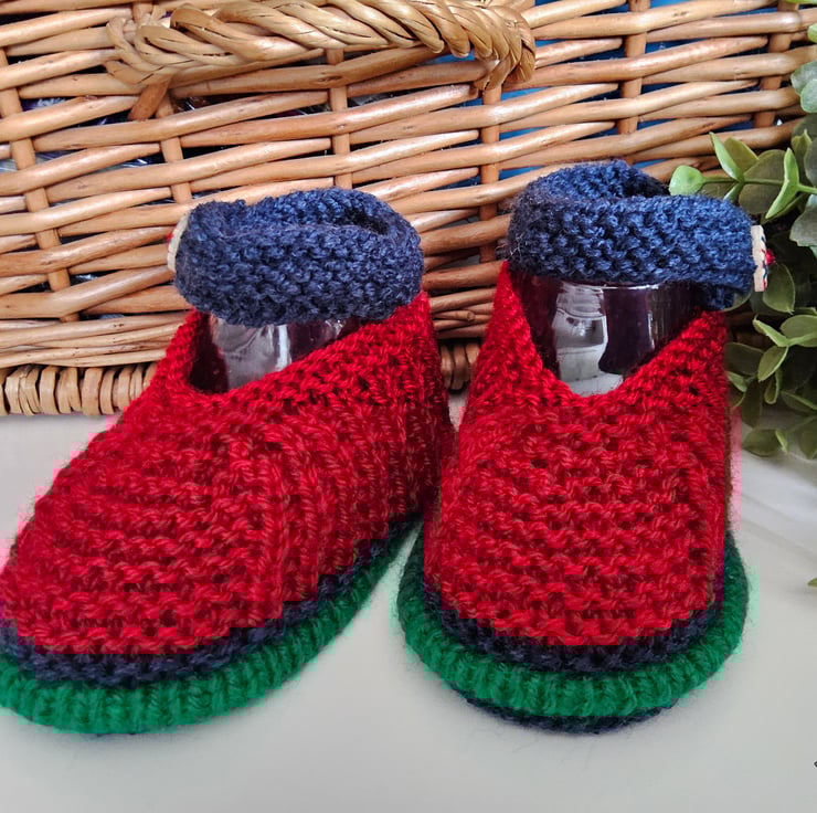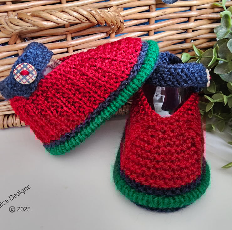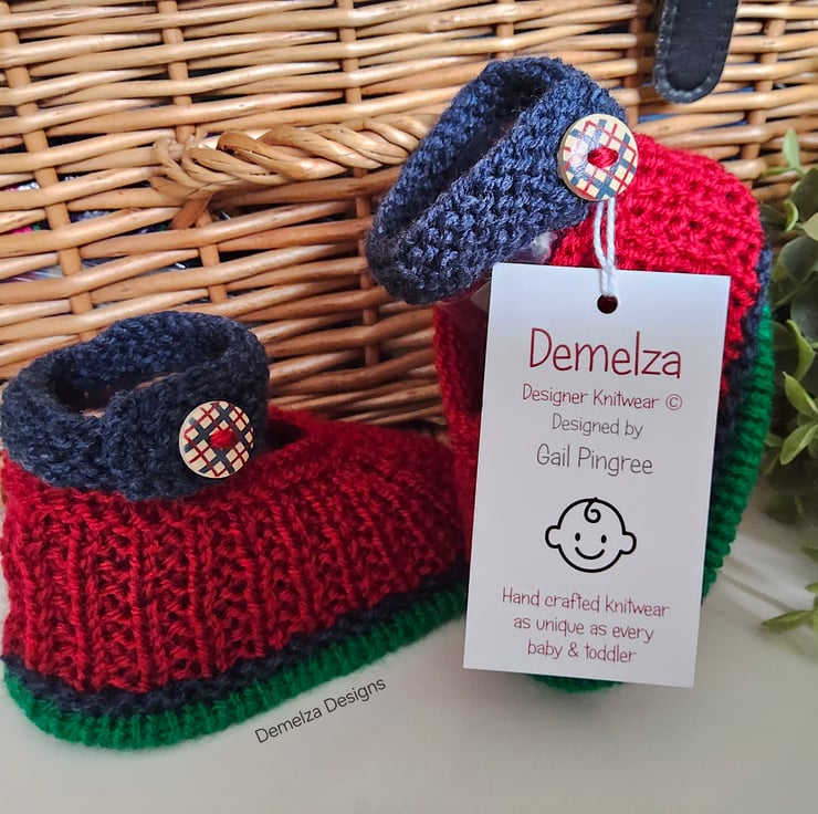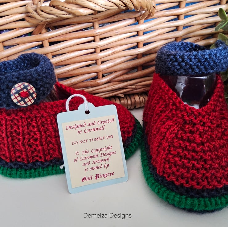 A sweet practical pair of baby boy's shoes designed and hand knitted in Cornwall using quality branded machine washable actylic yarns. They will keep those delicate toes cosy warm throughout the following cold months. On one shoe the soft luxury damask branded Demelza Designs garment label has been attached to the back shoe seam with the care instructions woven on the reverse side for lasting reference. The buttons are made from genuine wood with a printed varnished sealed design on them. A Demelza Designs garment swing tag will also be attached as proof of their origins if gifting and to provide a professional finish.