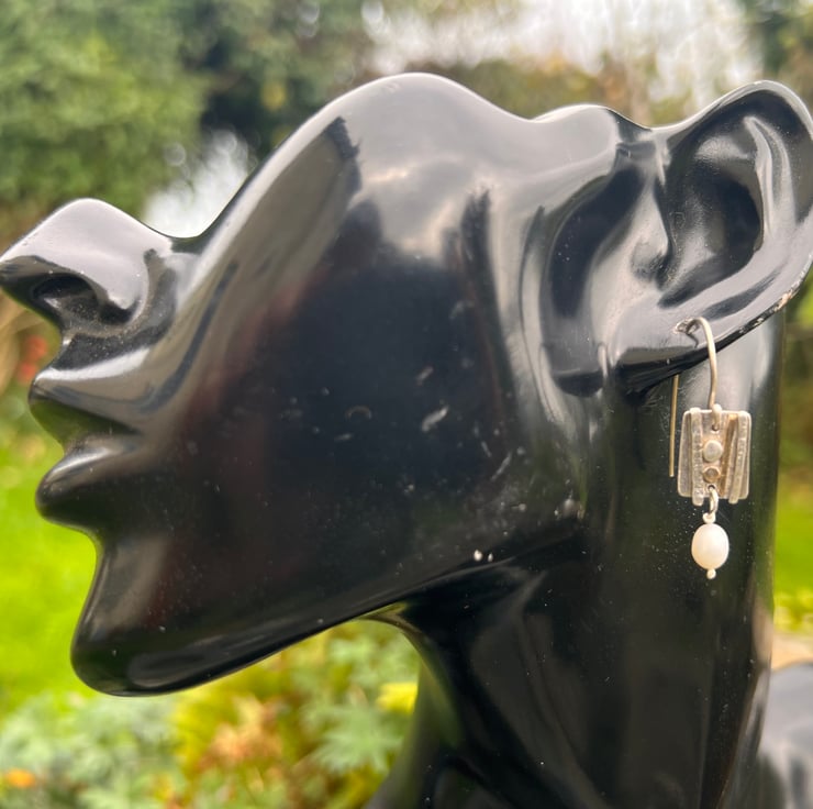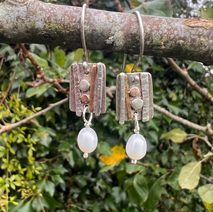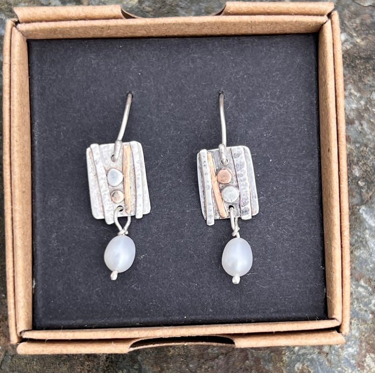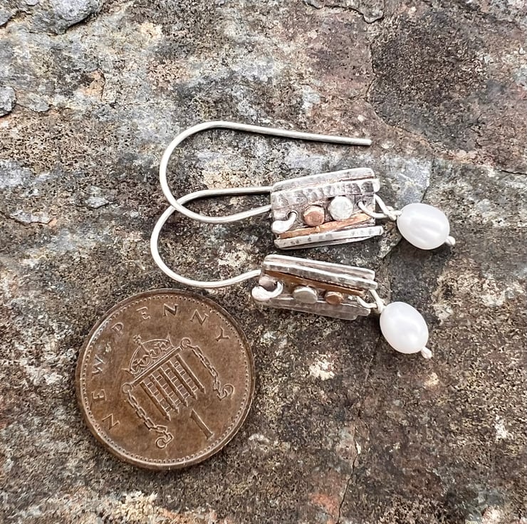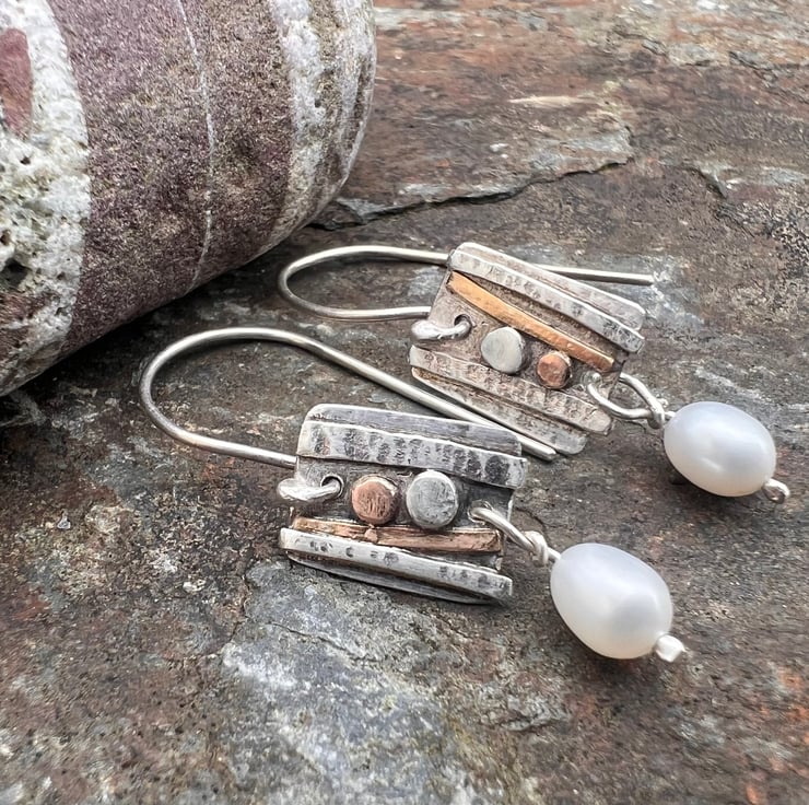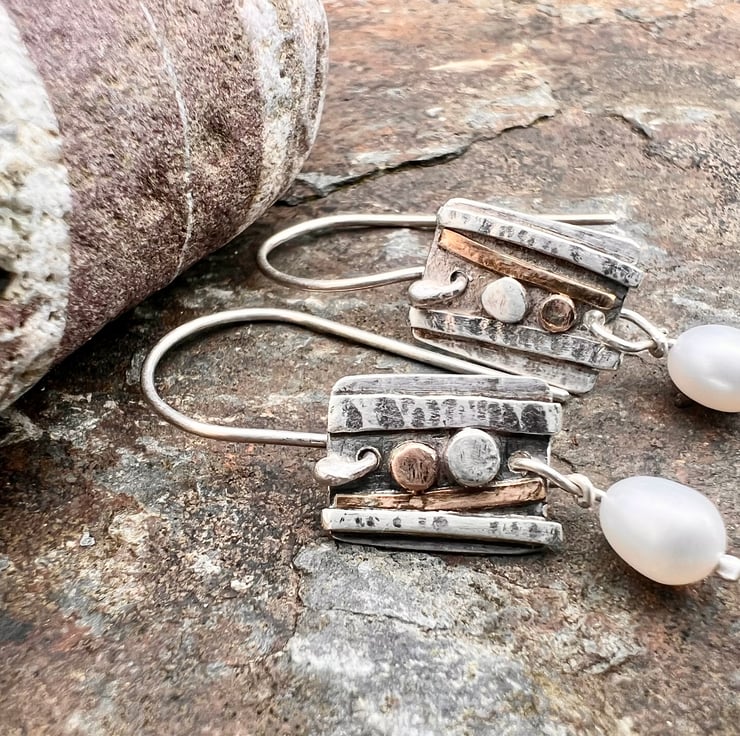 Sterling silver and gold earrings with a freshwater pearl drop, inspired by the strata and rock formations of the Wales shoreline. They have textured decoration made with hammered sterling silver wire and gold filled wire . The gold filled wire is 12% gold and is more durable than gold plated The 'pebbles' are made with circles of recycled 9ct gold and sterling silver.