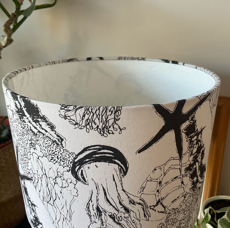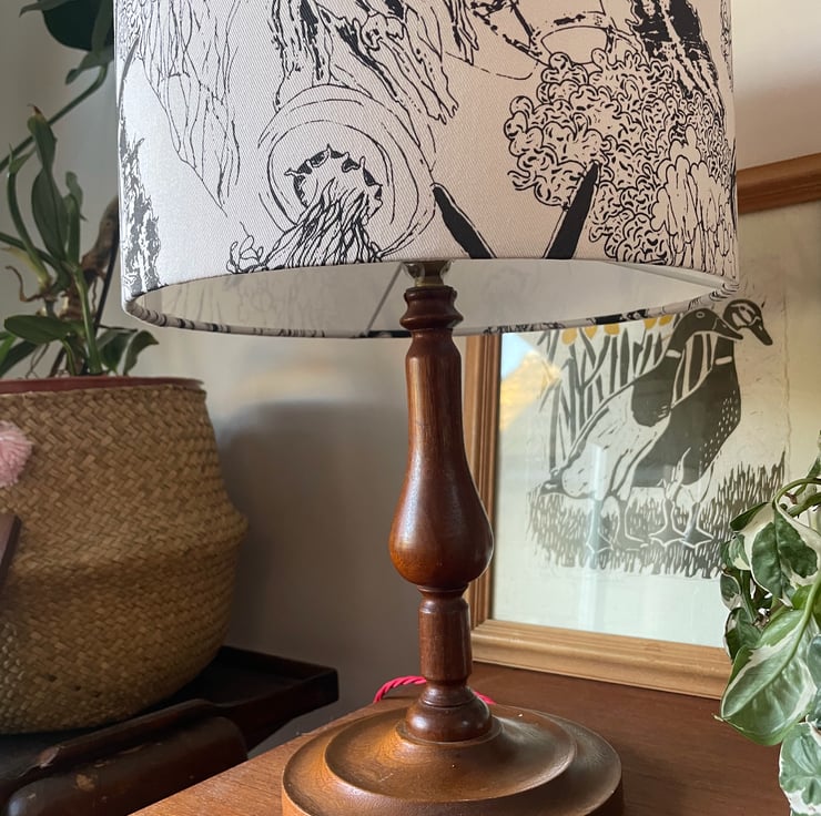 Bring an artistic touch of nature into your home with this handmade botanical lampshade, designed and crafted by me in my home studio. Featuring an intricate, hand-drawn style print of plants and organic forms in soft black ink on a natural linen-look fabric, this shade combines vintage charm with modern craftsmanship.