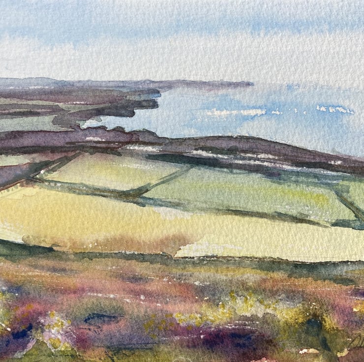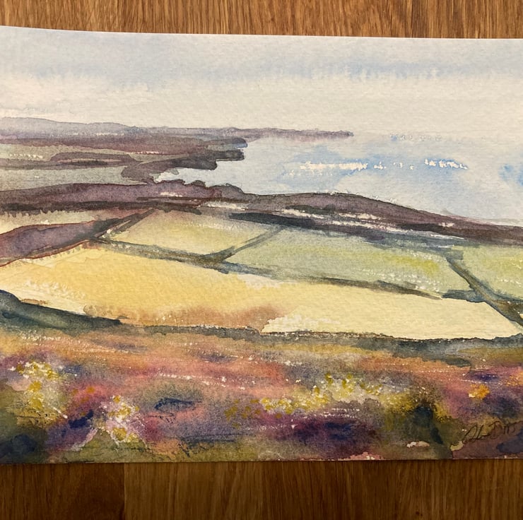 A small original watercolour painting of a view from the North Cornwall coastal path, signed by the artist. This painting is UNFRAMED. Approx. dimensions: 18cm x 14cm.
