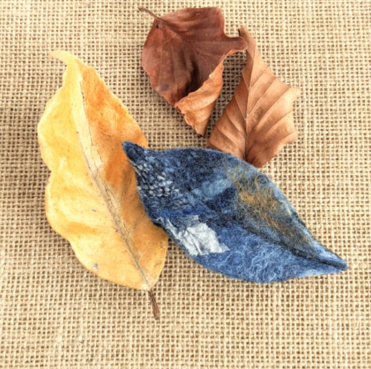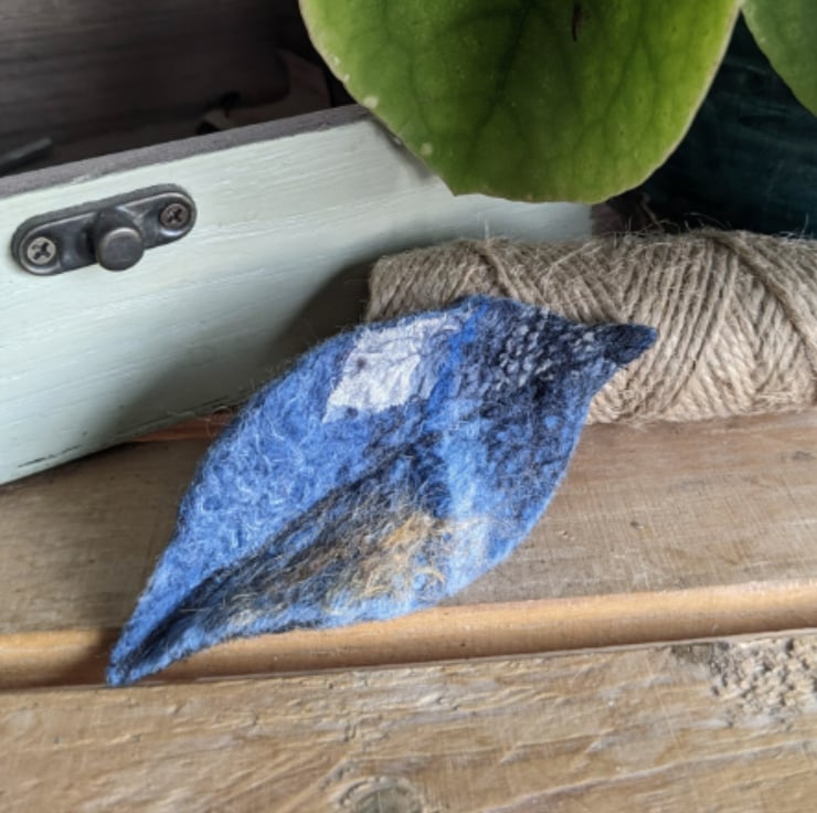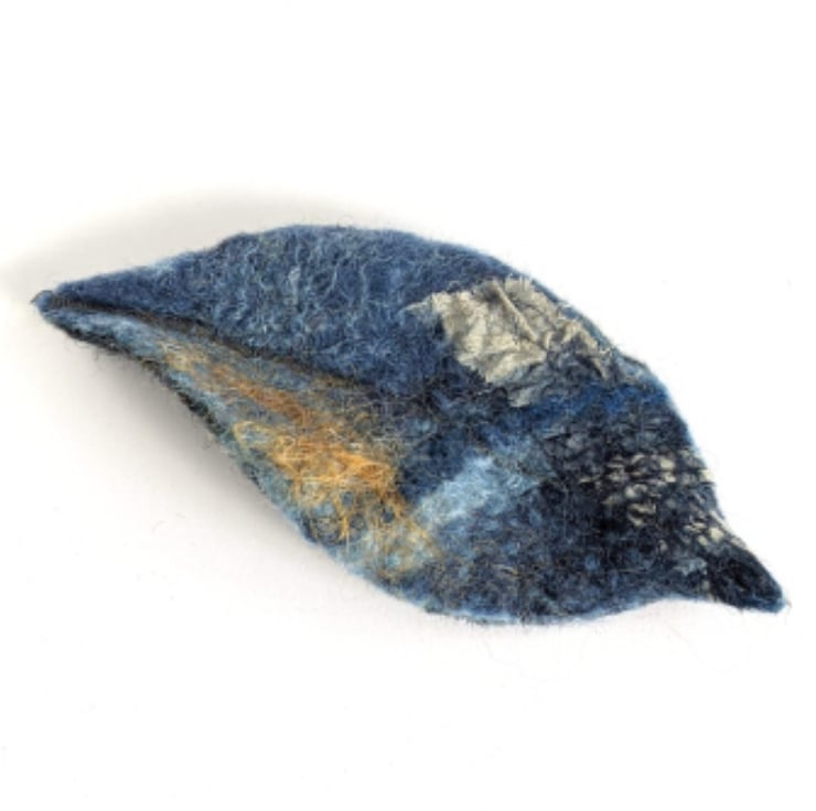 Felted leaf brooch handmade from soft merino wool in rich shades of blue. It is embellished with upcycled silk fabric and silk threads for subtle texture and shine, then lightly stiffened so that it retains its sculptural qualities.