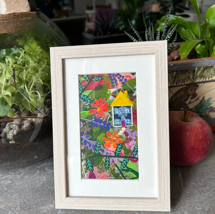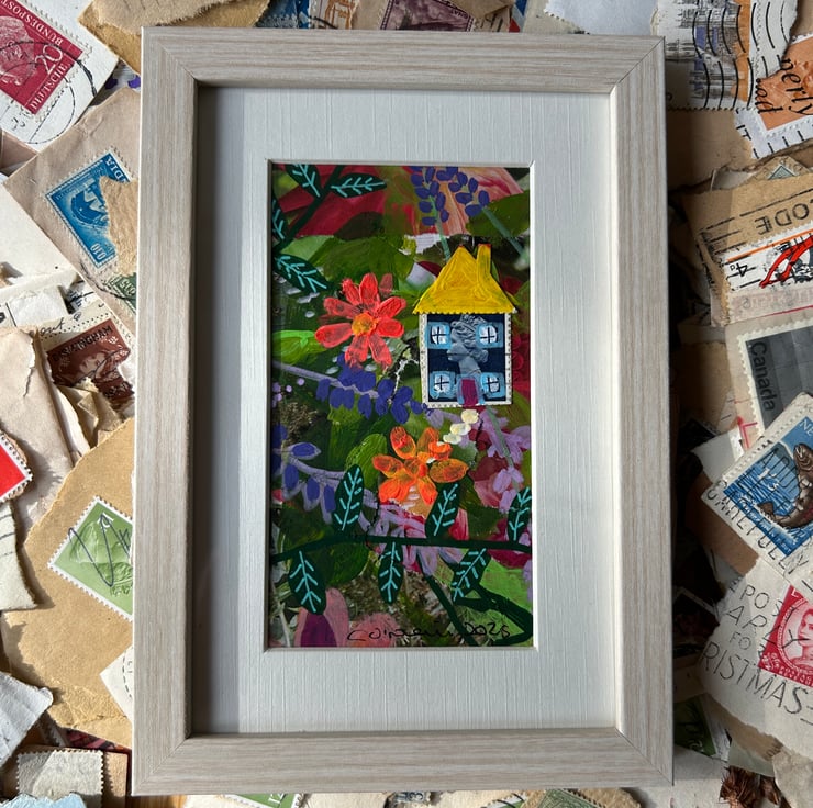 A brightly coloured picture made of collage and acrylic paints. The little house is made from an old postage stamp. The background is multicoloured acrylic paints on collaged papers. I have displayed others of this style which are all different