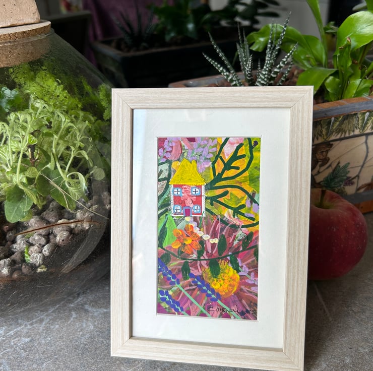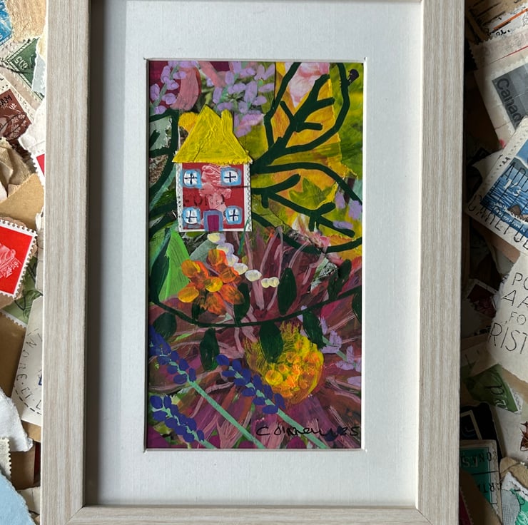 A brightly coloured picture made of collage and acrylic paints. The little house is made from an old postage stamp. The background is multicoloured acrylic paints on collaged papers. I have displayed others of this style which are all different