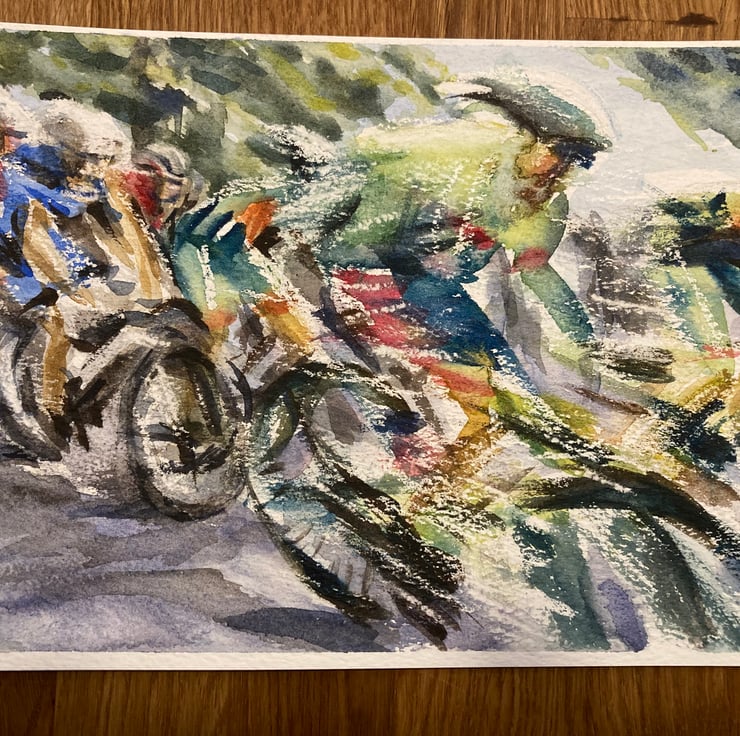 An original, semi-abstract watercolour painting of a cycling peloton racing by, signed by the artist. This painting is UNFRAMED. Approx. dimensions: 25cm x 17cm.