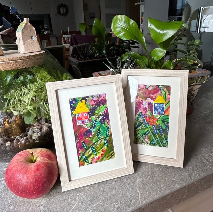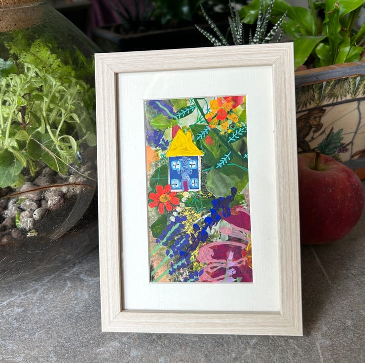 A brightly coloured picture made of collage and acrylic paints. The little house is made from an old postage stamp. The background is multicoloured acrylic paints on collaged papers. I have displayed others of this style which are all different