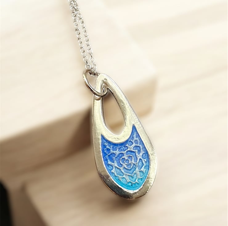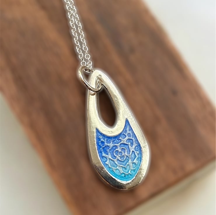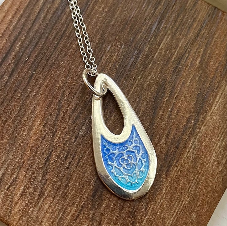 This pendant uses the basse-taille enamelling technique when transparent enamel is applied to a textured pendant such that the texture is seen through the enamel.