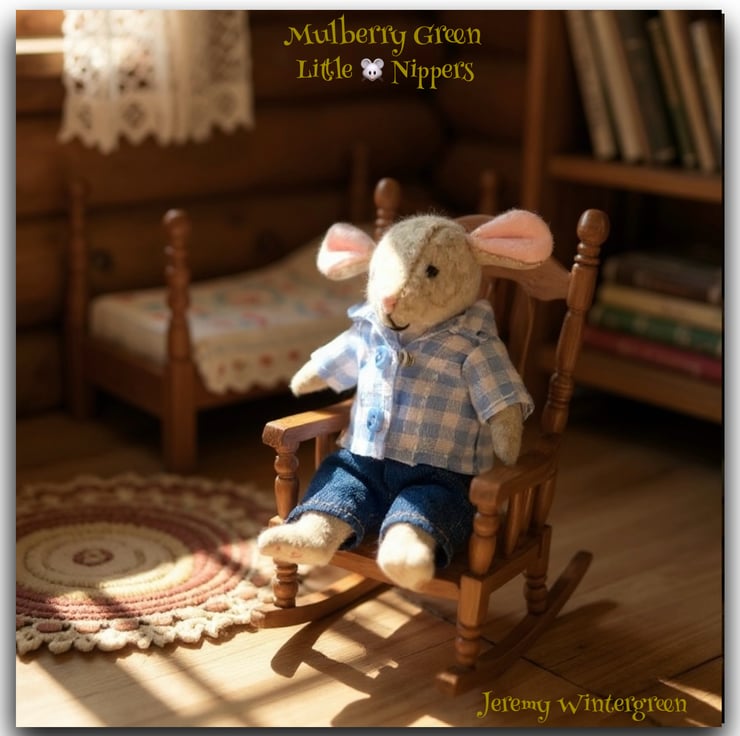 Jeremy Wintergreen, in his blue checked shirt and jeans, is one of the Little Nippers - tiny mice who live in a maze of tunnels underneath the barn at Mulberry Farm. All of the Little Nippers are named after herbs and meadow flowers. The Little Nippers are 14cm tall. Clothes made especially to fit them are also available in my shop.