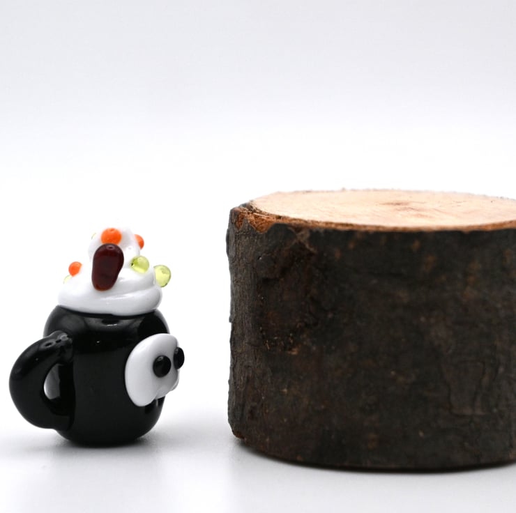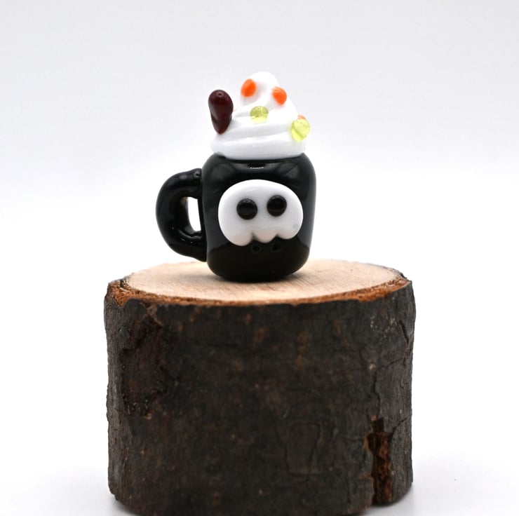 A small glass hot drink with cream in a ghost cup made by hand using a technique called lampworking.