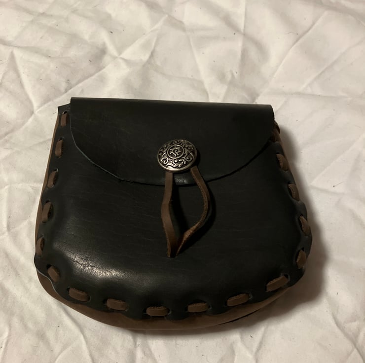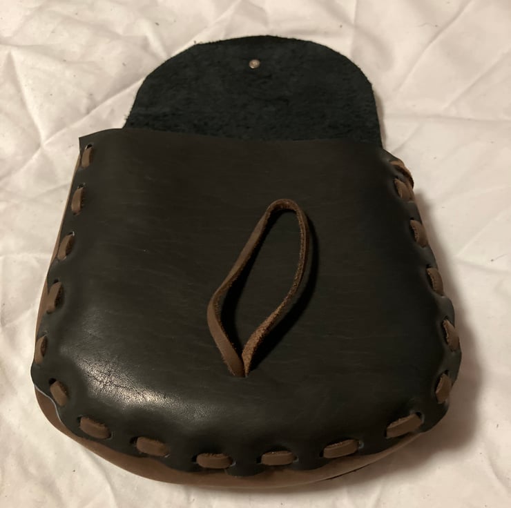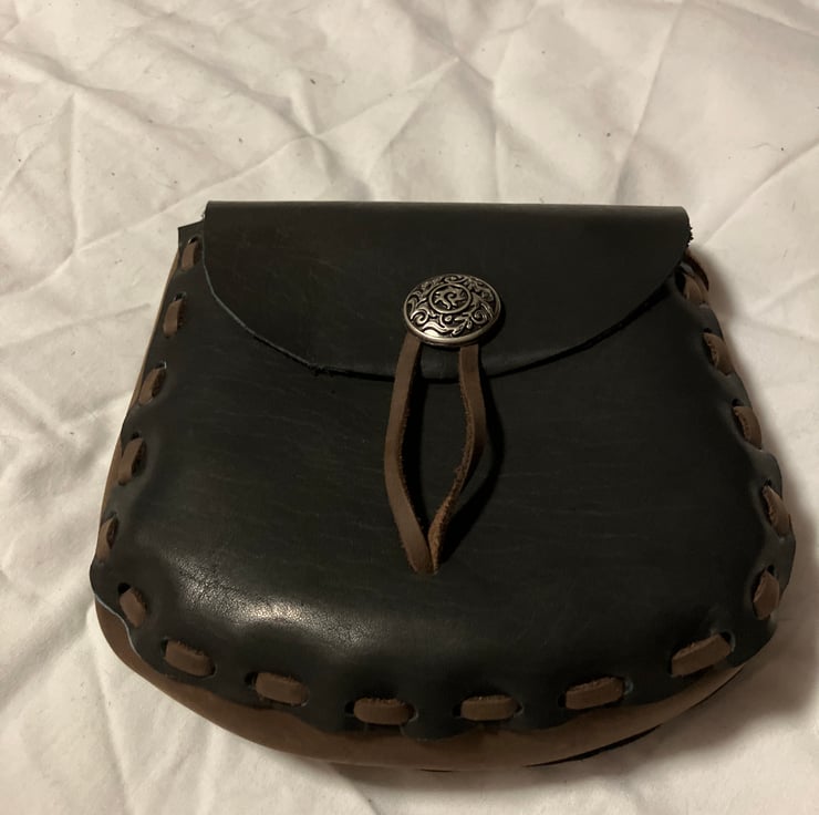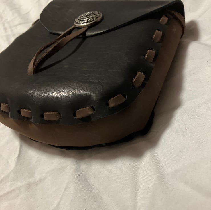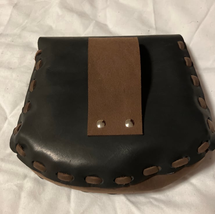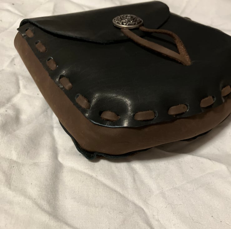 Black coloured Leather Medieval / Renaissance Style Pouch with Decorative button closure. Gusset (and belt loop in back) is a Brown coloured leather. FREE SHIPPING