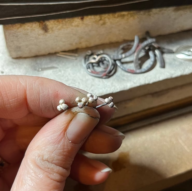 These cute tiny little berry stud earrings are made from my silver scrap metal which has been melted down into balls and soldered together, a sterling silver post is then soldered & sterling silver scrolls added. These sweet little studs have a shiny finish and are perfect for everyday wear.