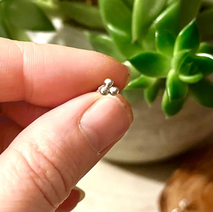 These cute tiny little berry stud earrings are made from my silver scrap metal which has been melted down into balls and soldered together, a sterling silver post is then soldered & sterling silver scrolls added. These sweet little studs have a shiny finish and are perfect for everyday wear.