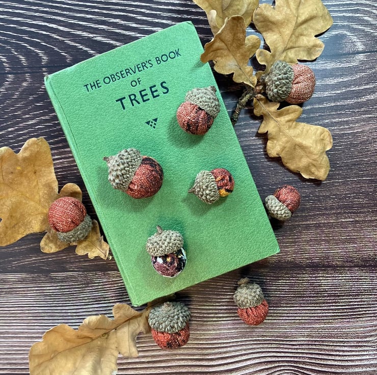 Hand made from genuine 1950s vintage cotton barkcloth and a real acorn cap, each one is completely unique.