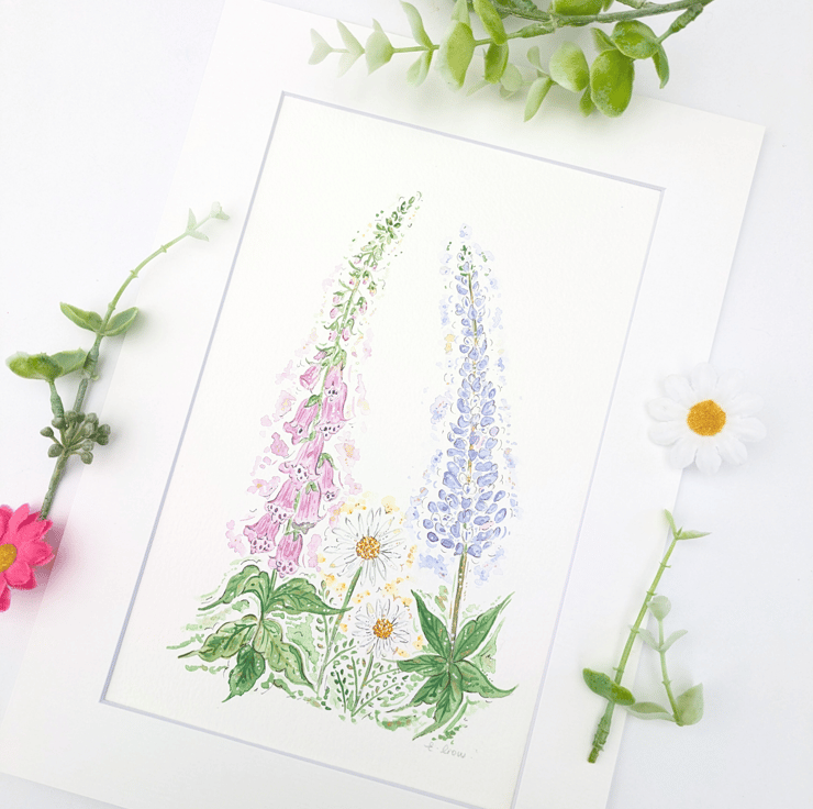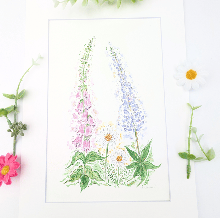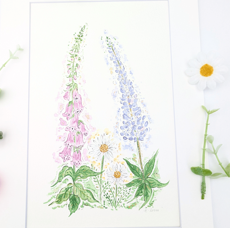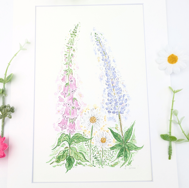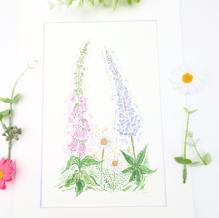 A beautiful and delicate Foxglove, daisy and lupin original signed watercolour painting (not a print). Mounted in an A4 white textured mount.