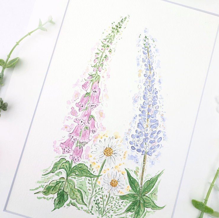 Foxglove, Daisy and Lupin original watercolour flower painting