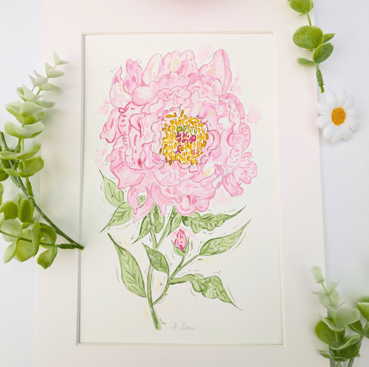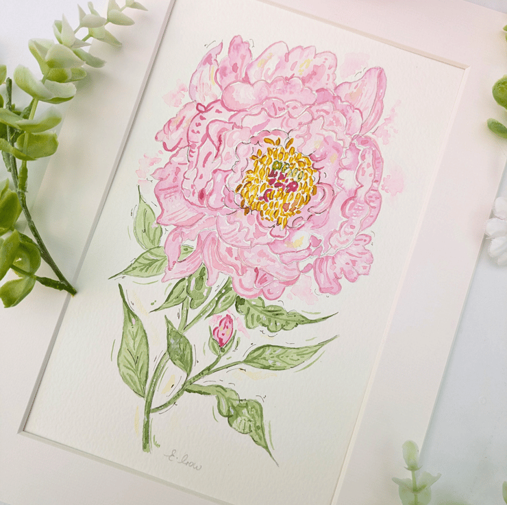 A Pretty Peony original signed watercolour flower painting (not print). Stylishly mounted in a A4 white textured mount. Painted with artist's watercolours on Winsor and Newton 140lb cold pressed (textured) watercolour paper.