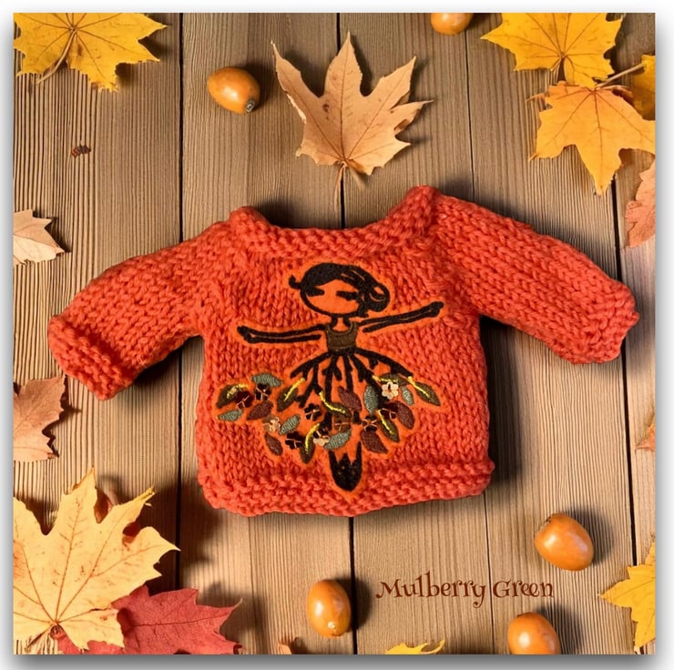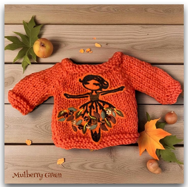 A really pretty pumpkin orange jumper, embroidered with an Autumn ballerina, to fit the Mulberry Green characters. The jumper is hand knitted and fastens with a little popper at the back.