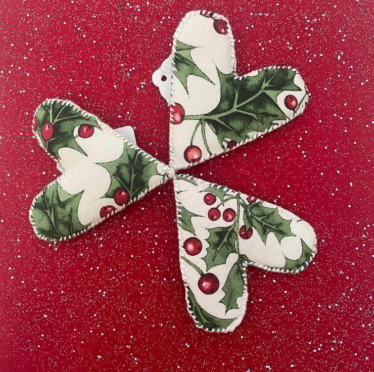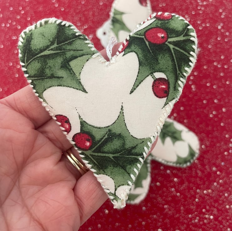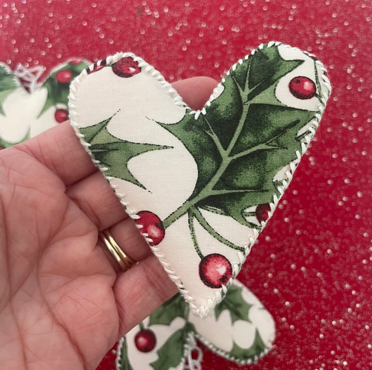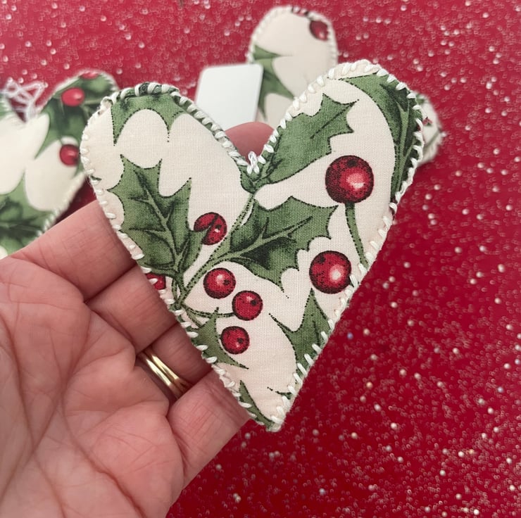 Each heart is made from a 100% cotton, lightly padded with a polyester foam and has been hand sewn for that truly unique touch. A thin glittery silvery cotton allows these decorations to hang delicately and twirl amongst your twinkly lights.