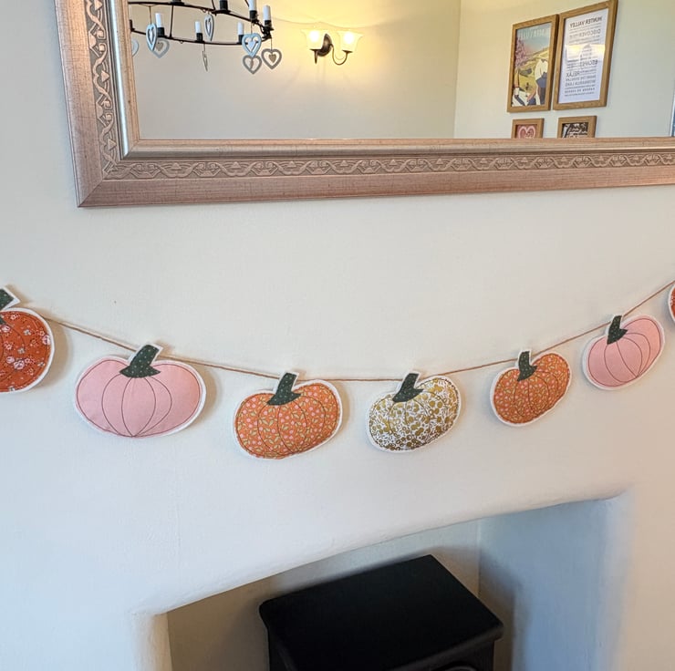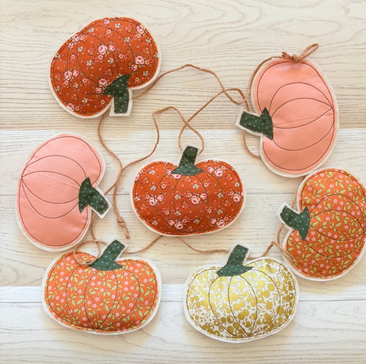 A string of seven fabric and felt pumpkins to add a touch of cosy autumn vibes to your home.