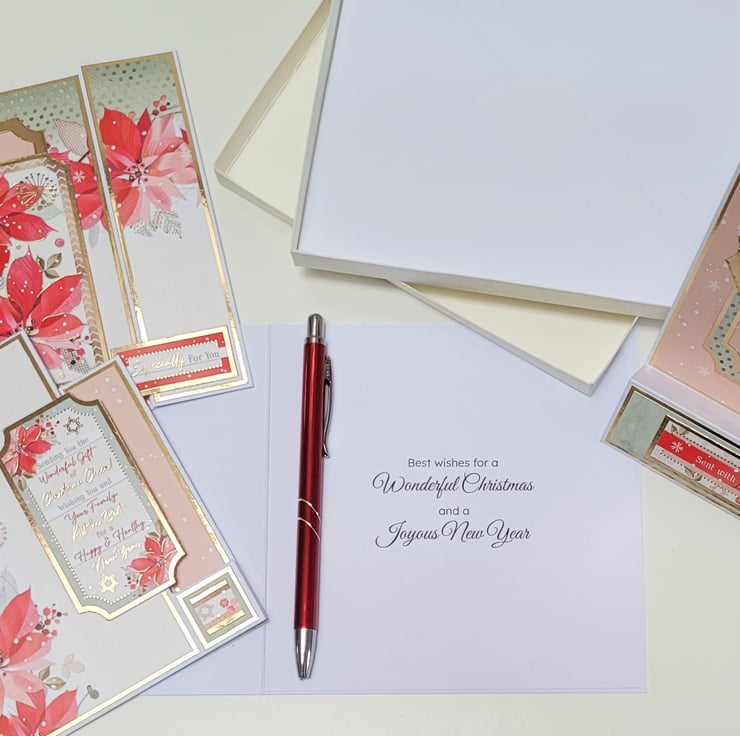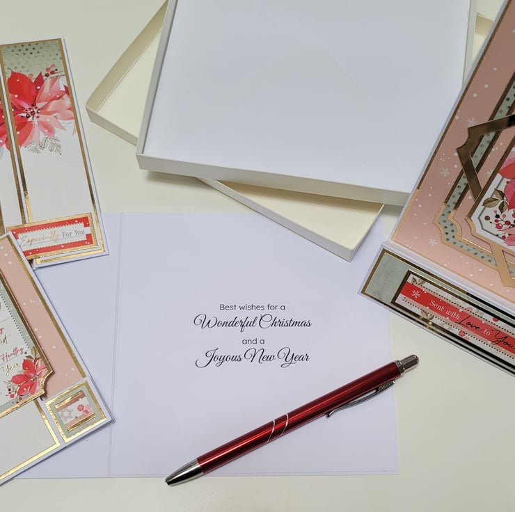 Each card measures 5.5 x 5.5 inches (14 x 14 cm), are supplied with plain white envelopes, and all contain a sentiment on the inside of the card which reads "Best wishes for a wonderful Christmas and a joyous new year".