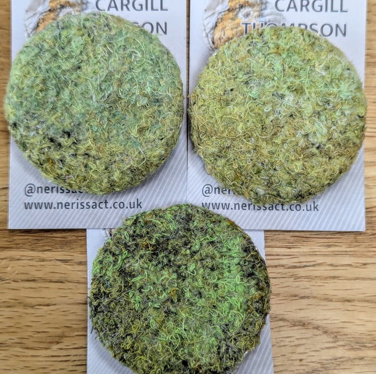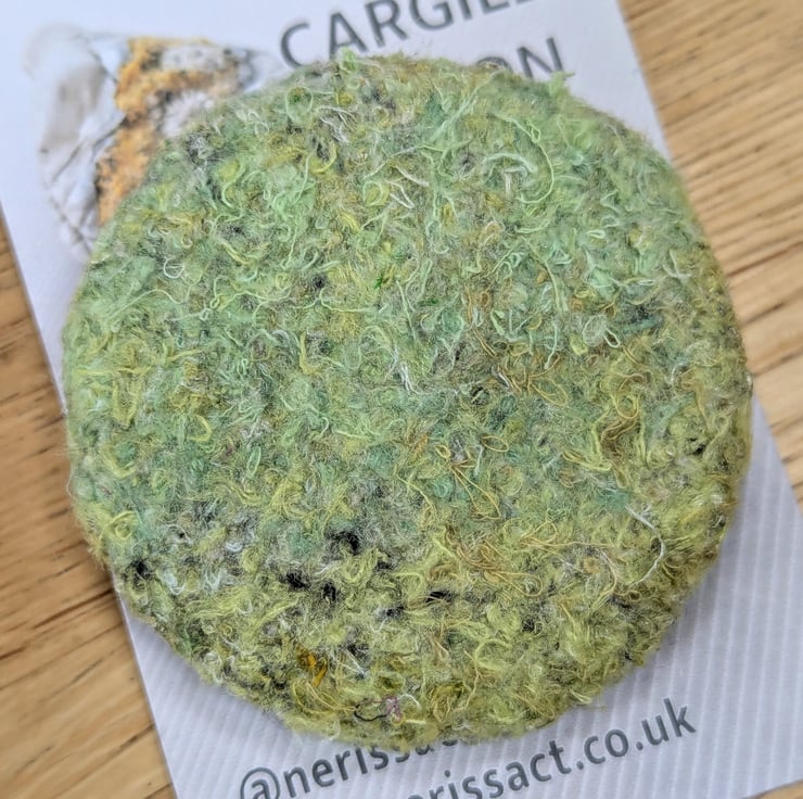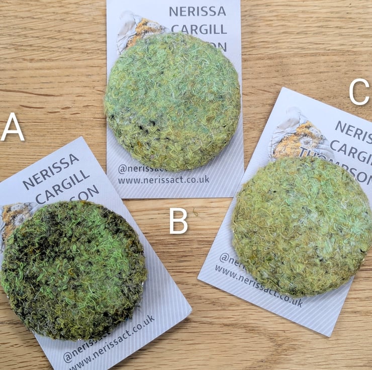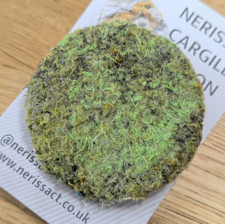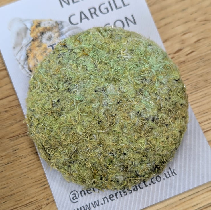 To limit my waste, I turn my colourful textile offcuts into jewellery. The embellished textiles are mounted onto 50mm commercial brooch backs using a strong fabric glue and have a standard rolling safety clasp.