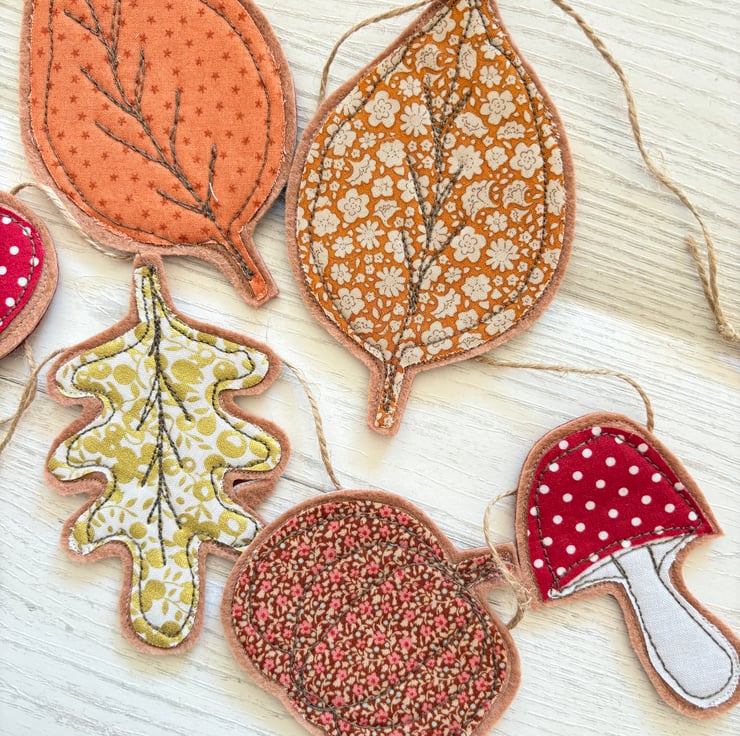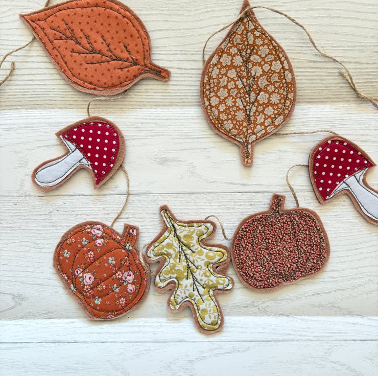 A string of Autumn loveliness! Leaves, pumpkins, toadstools in pretty autumn hues. The motifs are made from fabric stitched to a double felt backing sandwiched with interfacing giving them a good firm look. They are strung on natural twine adding to the rustic look.