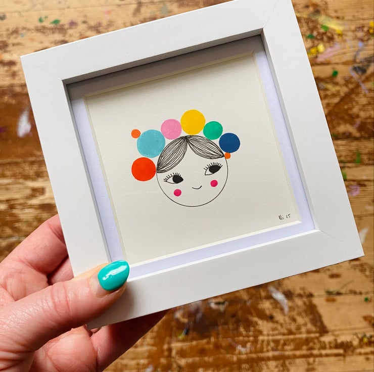 Sweet little illustration finished in Holbein Gouache, measuring 8 x 8 cm set in a simple mount and white 12 x 12 cm frame, ready to pop straight in to your wall!