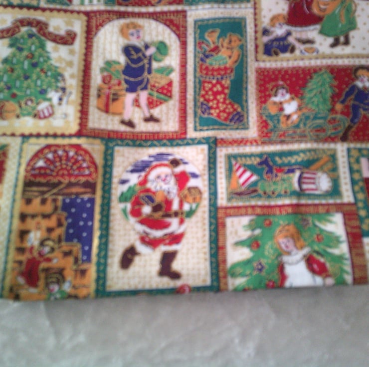 This Fabric bag is made using a 100% Cotton Fabric featuring Christmas Themed squares with Children, Bells, Father Christmas and Christmas Trees on a Cream background.