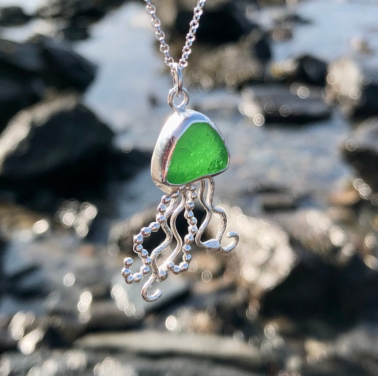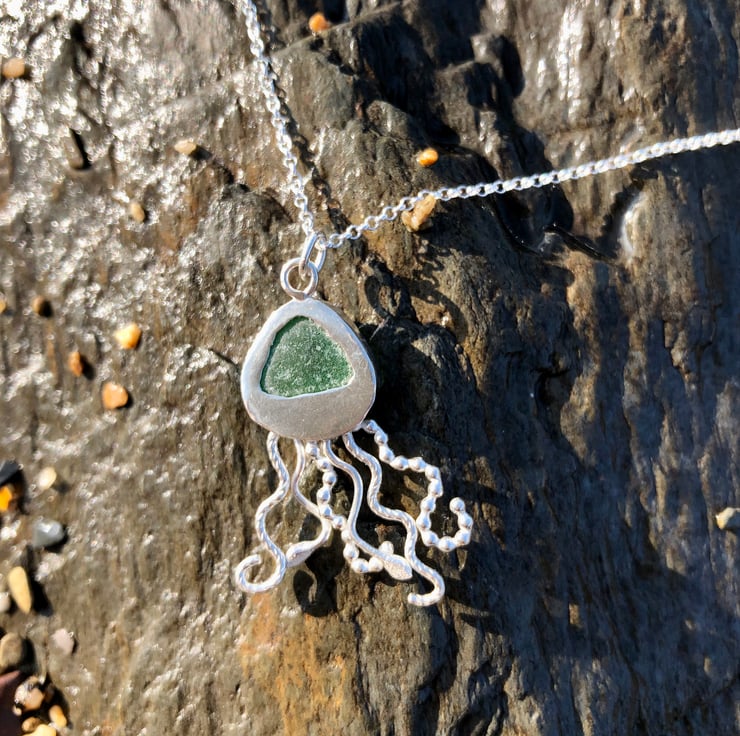 This gorgeous kelly green piece of sea glass was found along the UK's South West coastline and has been set in a fine silver bezel (.999) and using a mix of recycled (ecosilver) sterling silver wire, beaded wire and twisted silver (.925) to create a beautifully unique Jelly fish pendant. The back of the pendant has been left open so that the gorgeous colour of the sea glass can shine through.
