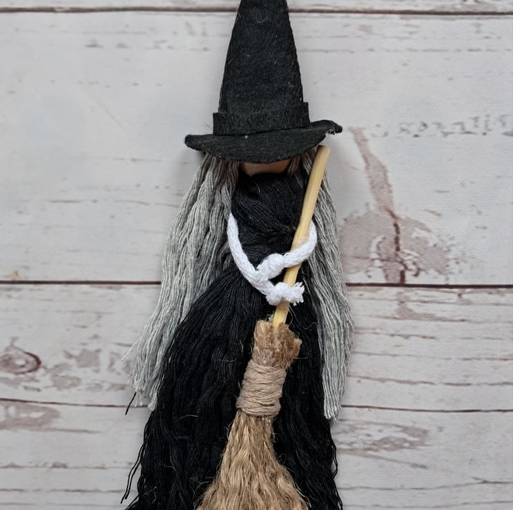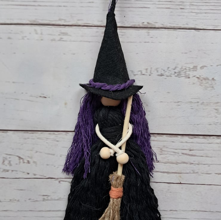 Spooky and cute handmade macrame witch dolls. They come holding a handmade broomstick with either orange, white,grey or purple hair.